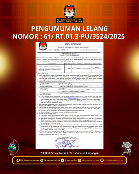 #TemanPemilih KPU Kabupateng Lamongan menyampaikan Lelang Nomor : 61/RT.01.3-Pu/3524/2025 Selengkapnya bisa Lihat Disini ....
