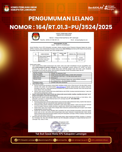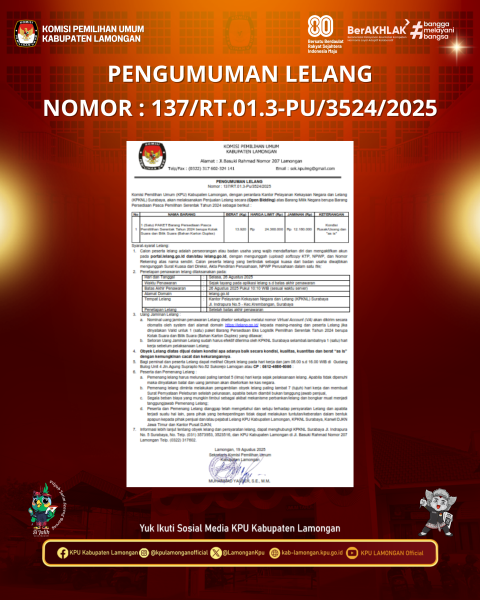 #TemanPemilih KPU Kabupateng Lamongan menyampaikan Lelang Nomor : 137/RT.01.3-Pu/3524/2025 Selengkapnya bisa Cek Disini ....