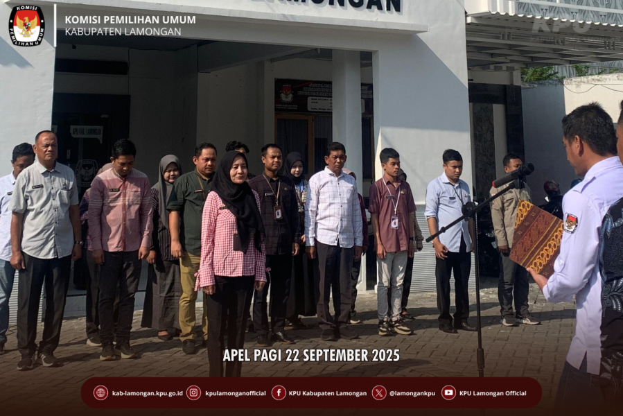 kab-lamongan.kpu.go.id Lamongan-Komisi Pemilihan Umum (KPU) Kabupaten Lamongan pada hari ini kembali melaksanakan apel pagi rutin di halaman kantor KPU pada Senin (22/9/2025). Apel dipimpin oleh Anggota KPU Lamongan Divisi Teknis, Hafid Hamsah, yang diikuti oleh jajaran Komisioner, Sekretariat, serta seluruh staf. Dalam amanatnya, Hafid mengingatkan pentingnya menjaga kesehatan di tengah padatnya aktivitas kerja. Menurutnya, kondisi tubuh yang sehat merupakan kunci utama agar setiap pegawai mampu melaksanakan tugas dengan maksimal. Ia juga menegaskan agar seluruh pekerjaan dapat diselesaikan dengan baik, penuh tanggung jawab, dan tepat waktu sesuai dengan aturan dan target yang telah ditentukan. Selain itu, Hafid menekankan bahwa kedisiplinan dan kekompakan dalam bekerja harus terus dijaga, sehingga seluruh rangkaian kegiatan di KPU Kabupaten Lamongan dapat berjalan lancar dan optimal. Apel pagi ini tidak hanya menjadi agenda rutin, namun juga menjadi sarana untuk mempererat kebersamaan, menyamakan persepsi, serta membangun semangat kerja bersama dalam mendukung tugas dan fungsi KPU. ....