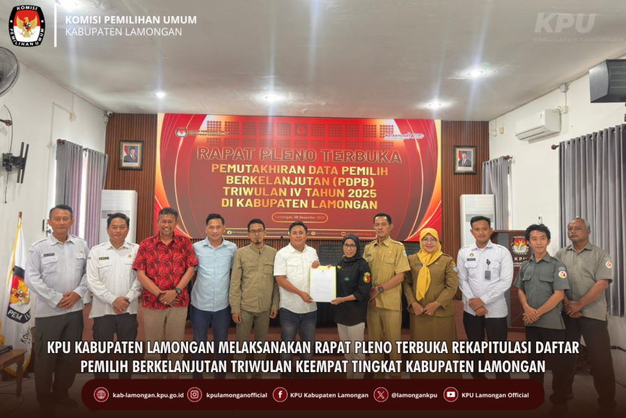 kab-lamongan.kpu.go.id Lamongan-KPU Kabupaten Lamongan melaksanakan Rapat Pleno Terbuka Rekapitulasi Daftar Pemilih Berkelanjutan (DPB) Triwulan Keempat Tingkat Kabupaten Lamongan untuk kegiatan Pemutakhiran Data Pemilh Berkelanjutan PDPB. Acara diselenggarakan di Aula KPU Kabupaten Lamongan pada hari Senin (8/12/2025). Rapat pleno dihadiri oleh Ketua dan Anggota KPU dan jajaran Sekretariat KPU Kab. Lamongan, Bawaslu Kab.Lamongan, KODIM 0812/Lamongan, Polres Kab. Lamongan, Bakesbanpol Kab. Lamongan, Disdukcapil Kab. Lamongan dan Lapas Kab. Lamongan. Rapat Pleno KPU Kabupaten Lamongan dibuka secara khidmat oleh Mahrus Ali, Ketua KPU Kabupaten Lamongan, kemudian dilanjutkan dengan pembacaan tata tertib oleh Achmad Shohib, Divisi Perencanaan, Data dan Informasi. Pada kesempatan awal, Yulianti selaku Koordinator Divisi Pencegahan, Partisipasi Masyarakat, dan Humas, Anggota Bawaslu Kabupaten Lamongan, memberikan catatan serta saran perbaikan atas pelaksanaan PDPB Triwulan Keempat. Menanggapi hal tersebut, Achmad Shohib menyatakan komitmennya untuk segera menindaklanjuti berbagai masukan yang disampaikan Bawaslu. Rapat kemudian ditutup oleh penyampaian pesan mengenai dinamika dan permasalahan yang dihadapi selama proses pendataan. Melalui rapat pleno ini, KPU Kabupaten Lamongan berharap terjalin komunikasi yang harmonis antarinstansi dan lembaga, sehingga pelaksanaan Pemutakhiran Data Pemilih Berkelanjutan dapat berjalan sesuai ketentuan serta menjunjung asas transparansi. ....