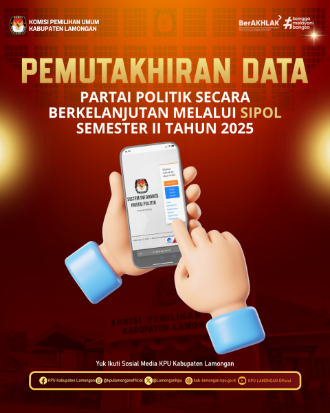 #Temanpemilih Guna memastikan data partai politik (parpol) tetap valid, akurat, dan mutakhir, Komisi Pemilihan Umum Kabupaten Lamongan telah mensosialisasikan kepada Partai Politik tingkat Kabupaten Lamongan untuk melaksanakan Pemutakhiran Data Parpol Secara Berkelanjutan melalui Sistem Informasi Partai Politik (Sipol) Semester II Tahun 2025. Adapun data yang dilakukan pemutakhiran meliputi kepengurusan partai, keterwakilan perempuan, keanggotaan, serta domisili kantor tetap. Nah #KamuPerluTahu, daftar partai politik yang melakukan pemutakhiran data parpol secara berkelanjutan melalui Sipol pada Semester II Tahun 2025 dapat dilihat sebagaimana tersaji dalam Unggahan Ini !! ???? Sistem Informasi Partai Politik (Sipol) dapat diakses melalui: https://sipol.kpu.go.id/ Untuk informasi lebih lanjut terkait Pemutakhiran Data Parpol, silakan menghubungi narahubung KPU Kabupaten Lamongan: Emi Setiawati (0857-3237-8749) Semoga informasi ini bermanfaat. Jangan lupa like, share, dan komen #KPUMelayani ....