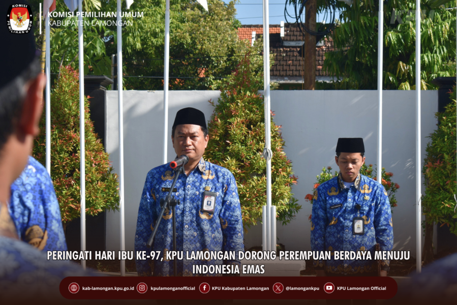Lamongan, kab-lamongan.kpu.go.id- Komisi Pemilihan Umum (KPU) Kabupaten Lamongan melaksanakan Upacara Peringatan Hari Ibu ke-97 pada Senin (22/12/2025) di halaman Kantor KPU Kabupaten Lamongan sebagai bentuk dorongan terhadap perempuan agar semakin berdaya dan berkarya menuju Indonesia Emas 2045. Kegiatan tersebut diikuti oleh para Kepala Subbagian (Kasubag) serta seluruh staf di lingkungan sekretariat KPU Kabupaten Lamongan. Bertindak sebagai Inspektur Upacara, Sekretaris KPU Kabupaten Lamongan, Muhammad Yasser, membacakan amanat Menteri Pemberdayaan Perempuan dan Perlindungan Anak (PPPA). Dalam amanat tersebut disampaikan bahwa Peringatan Hari Ibu merupakan momentum refleksi atas peran strategis perempuan dalam berbagai bidang pembangunan, termasuk dalam kehidupan demokrasi dan penyelenggaraan pemilu. Dalam amanatnya, ditegaskan bahwa tema Peringatan Hari Ibu tahun 2025 adalah “Perempuan Berdaya dan Berkarya, Menuju Indonesia Emas 2045”. Tema ini menjadi pengingat pentingnya pemberdayaan perempuan sebagai subjek pembangunan yang berkontribusi aktif dalam mewujudkan cita-cita bangsa. “Perempuan Indonesia telah membuktikan perannya sebagai penggerak perubahan, baik di lingkup keluarga, masyarakat, maupun dalam pembangunan nasional. Melalui peringatan Hari Ibu ini, kita diajak untuk terus mendukung perempuan agar berdaya, berkarya, dan berkontribusi nyata menuju Indonesia Emas 2045,” ujar Muhammad Yasser saat membacakan amanat Menteri PPPA. Melalui peringatan Hari Ibu ini, KPU Kabupaten Lamongan meneguhkan komitmennya untuk terus mendorong terciptanya lingkungan kerja yang inklusif, setara, dan mendukung peran perempuan, sejalan dengan nilai profesionalitas, kebersamaan, dan semangat pengabdian dalam penyelenggaraan pemilu. [ris/riq] ....