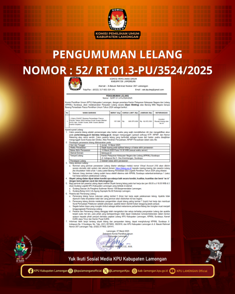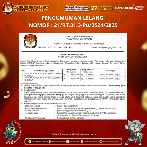 #Temanpemilih Komisi Pemilihan Umum (KPU) Kabupaten Lamongan, dengan perantara Kantor Pelayanan Kekayaan Negara dan Lelang (KPKNL) Surabaya, akan melaksanakan Penjualan Lelang secara (Open Bidding) atas Barang Milik Negara berupa Barang Persediaan Pasca Pemilihan Serentak Tahun 2024 sebagai berikut :