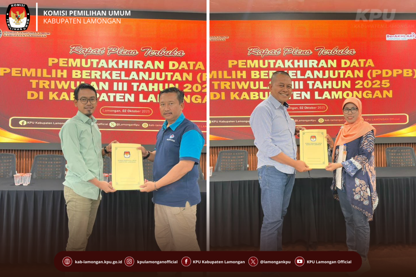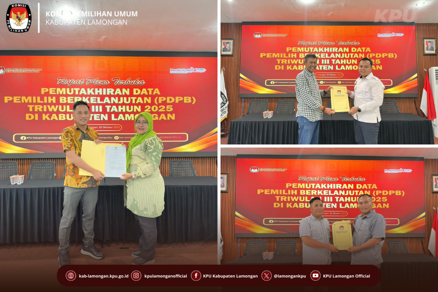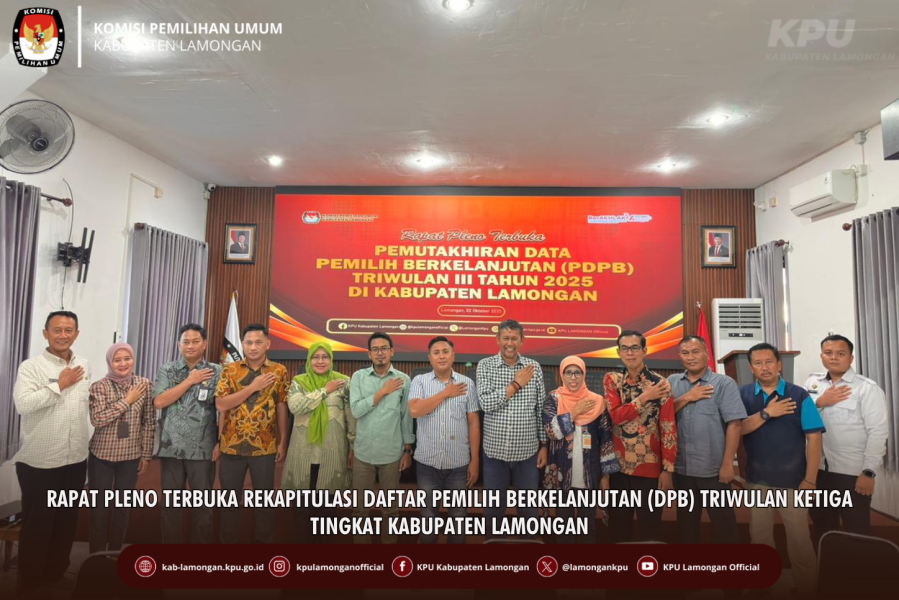 kab-lamongan.pu.go.id Lamongan-KPU Kabupaten Lamongan melaksanakan Rapat Pleno Terbuka Rekapitulasi Daftar Pemilih Berkelanjutan (DPB) Triwulan Ketiga Tingkat Kabupaten Lamongan untuk kegiatan Pemutakhiran Data Pemilh Berkelanjutan PDPB. Acara diselenggarakan di Aula KPU Kabupaten Lamongan pada hari Kamis (2/10/2025).