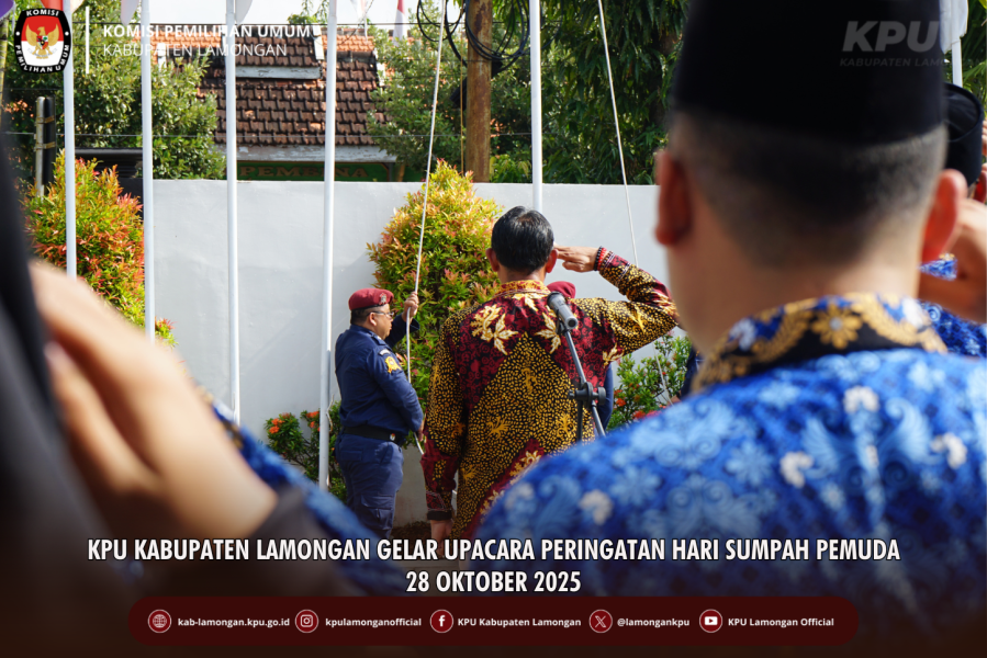 kab-lamongan.kpu.go.id Lamongan-Komisi Pemilihan Umum (KPU) Kabupaten Lamongan menggelar Upacara Peringatan Hari Sumpah Pemuda pada Senin pagi (28/10/2025) pukul 08.00 WIB di halaman kantor KPU Lamongan. Upacara dipimpin oleh Anggota KPU Divisi Hukum dan Pengawasan, Erfansyah Syahrir, dan diikuti oleh jajaran Sekretariat serta seluruh staf KPU Lamongan.