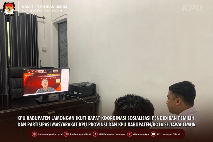 kab-lamongan.kpu.go.id Lamongan-Dalam rangka merencanakan sekaligus mengevaluasi kegiatan sosialisasi dan pendidikan pasca tahapan Pemilu dan Pilkada, KPU Kabupaten Lamongan mengikuti Rapat Koordinasi Kegiatan Sosialisasi, Pendidikan Pemilih, dan Partisipasi Masyarakat yang diselenggarakan oleh KPU Provinsi Jawa Timur secara daring melalui Zoom Meeting pada Selasa (11/11/2025). Kegiatan diikuti oleh staf Nilna Fakhri dan Ali Muharror.