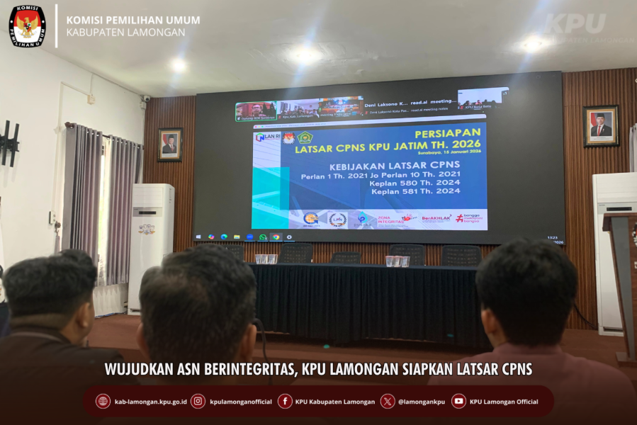 Lamongan, kab-lamongan.kpu.go.id- Sebagai bagian dari upaya menuju terwujudnya aparatur sipil negara yang berintegritas, Komisi Pemilihan Umum (KPU) Kabupaten Lamongan mengikuti kegiatan Persiapan Pelatihan Dasar (Latsar) Calon Pegawai Negeri Sipil (CPNS) di lingkungan Sekretariat KPU Provinsi dan KPU Kabupaten/Kota se-Jawa Timur pada Kamis (15/1/2026).