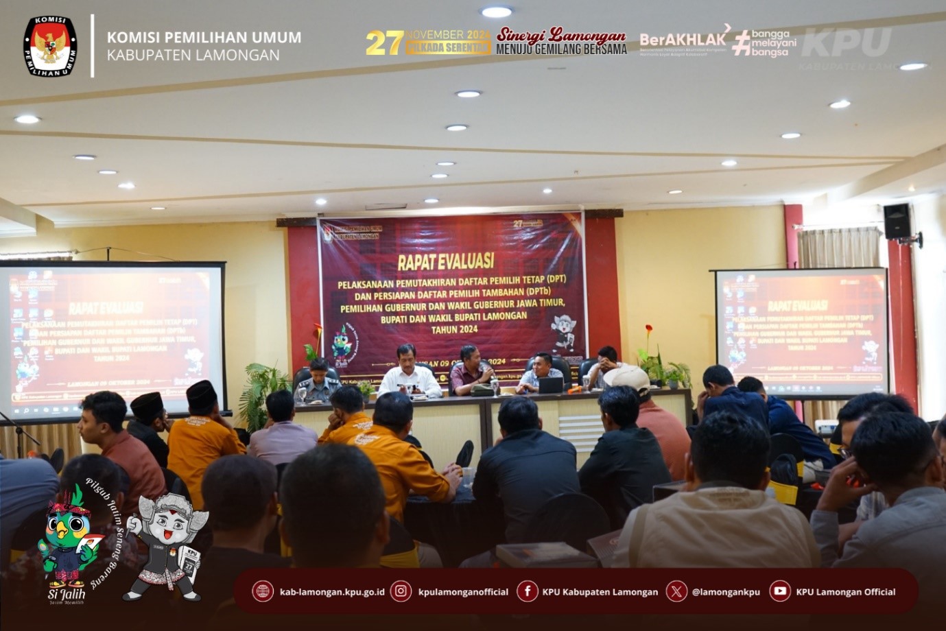 kab-lamongan.kpu.go.id Lamongan-Pada Rabu, 9 Oktober 2024, Komisi Pemilihan Umum (KPU) Kabupaten Lamongan mengadakan rapat evaluasi terkait pelaksanaan pemutakhiran Daftar Pemilih Tetap (DPT) dan persiapan penyusunan Daftar Pemilih Tambahan (DPTb) untuk Pemilihan Gubernur dan Wakil Gubernur Jawa Timur, serta Bupati dan Wakil Bupati Lamongan tahun 2024. Acara ini berlangsung di Hotel Elresas Lamongan dan dihadiri oleh berbagai pihak, termasuk Kepala Dinas Kependudukan dan Pencatatan Sipil (Disdukcapil) Kabupaten Lamongan.