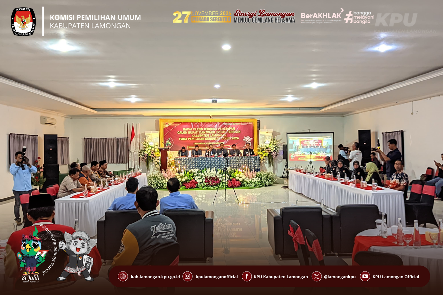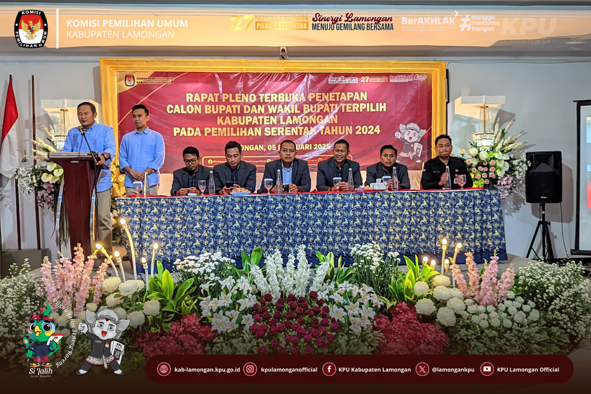 kab-lamongan.kpu.go.id Lamongan-Komisi Pemilihan Umum (KPU) Kabupaten Lamongan menggelar Rapat Pleno Terbuka Penetapan Calon Bupati dan Wakil Bupati Terpilih pada Pemilihan Serentak Tahun 2024. Acara ini berlangsung pada Rabu, 5 Februari 2025, di Aula RM. Aqiilah.