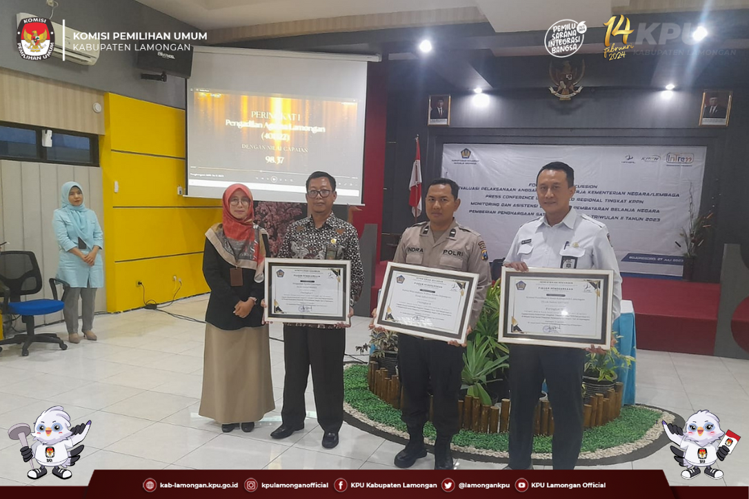 KPU Kabupaten Lamongan meraih Peringkat III Kategori Satuan Kerja Besar atas Capaian Kinerja Pelaksanaan Anggaran Triwulan II Tahun 2023 Satuan Kerja K/L di Wilayah Kerja Kantor Pelayanan Perbendaharaan Negara Tipe A2 Bojonegoro. Penghargaan diberikan oleh Amanah selaku Plt. Kepala Kantor Pelayanan Perbendaharaan Negara Tipe A2 Bojonegoro dan diterima oleh Okie Sidharta, Kasubbag Perencanaan, Data dan Informasi yang mewakili Kuasa Pengguna Anggaran (KPA) Kabupaten Lamongan. Okie Sidharta menyampaikan bahwa ini merupakan penghargaan kedua yang diterima oleh KPU Kabupaten Lamongan setelah pada bulan mei juga mendapatkan penghargaan untuk Triwulan I. Okie menerangkan penghargaan ini merupakan kerjasama dan kedisiplinan yang baik dalam manajemen keuangan di KPU Kabupaten Lamongan. "Semoga pada triwulan selanjutnya KPU Lamongan mendapatkan kembali penghargaan," harapannya.