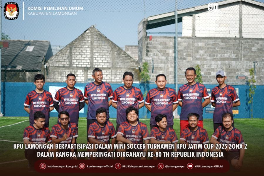kab-lamongan.kpu.go.id Lamongan-Dalam rangka memeriahkan peringatan Hari Ulang Tahun ke-80 Republik Indonesia, KPU Kabupaten Lamongan turut serta dalam pertandingan Mini Soccer yang digelar di Kabupaten Gresik pada Senin (10/08/2025). Ajang ini mempertemukan empat KPU Kabupaten di Zona 2, yaitu Gresik, Bojonegoro, Tuban dan Lamongan. Dibagi menjadi dua babak yang melahirkan 1 pemenang untuk mengikuti semifinal dengan Kabupaten/Kota Zona lainnya.