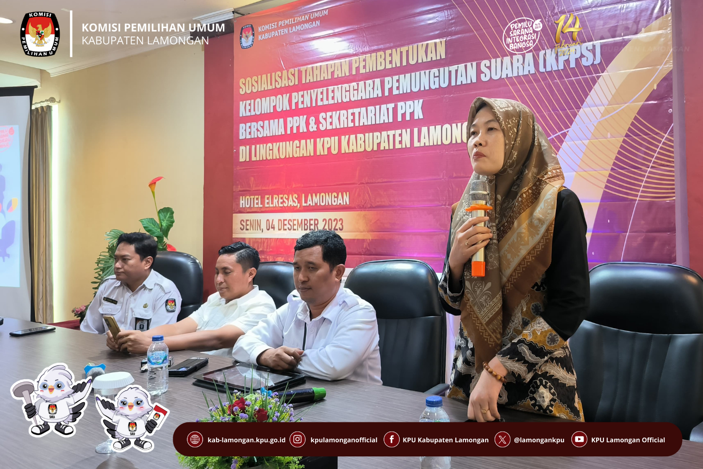 Dewi Mashlahatul Ummah, Divisi Perencanaan, Data dan Informasi, dalam sambutannya menjelaskan bahwa nantinya akan dibuka pendaftaran KPPS 11 November. Dewi meminta kesempatan Sosialisasi ini dimanfaatkan dengan baik untuk Pembentukan KPPS. "KPPS ibaratkan ujung tombak Teknis Penyelenggaraan pemilu", jelas Dewi. Berhasilnya membentuk KPPS sebagai bentuk menuju berhasilnya Penyelenggaraan Pemilu 2024. Materi mengenai Tahapan Pembentukan KPPS disampaikan oleh Khoirul Anam selaku Divisi Sosialisasi, Pendidikan Pemilih, Partisipasi Masyarakat dan SDM.