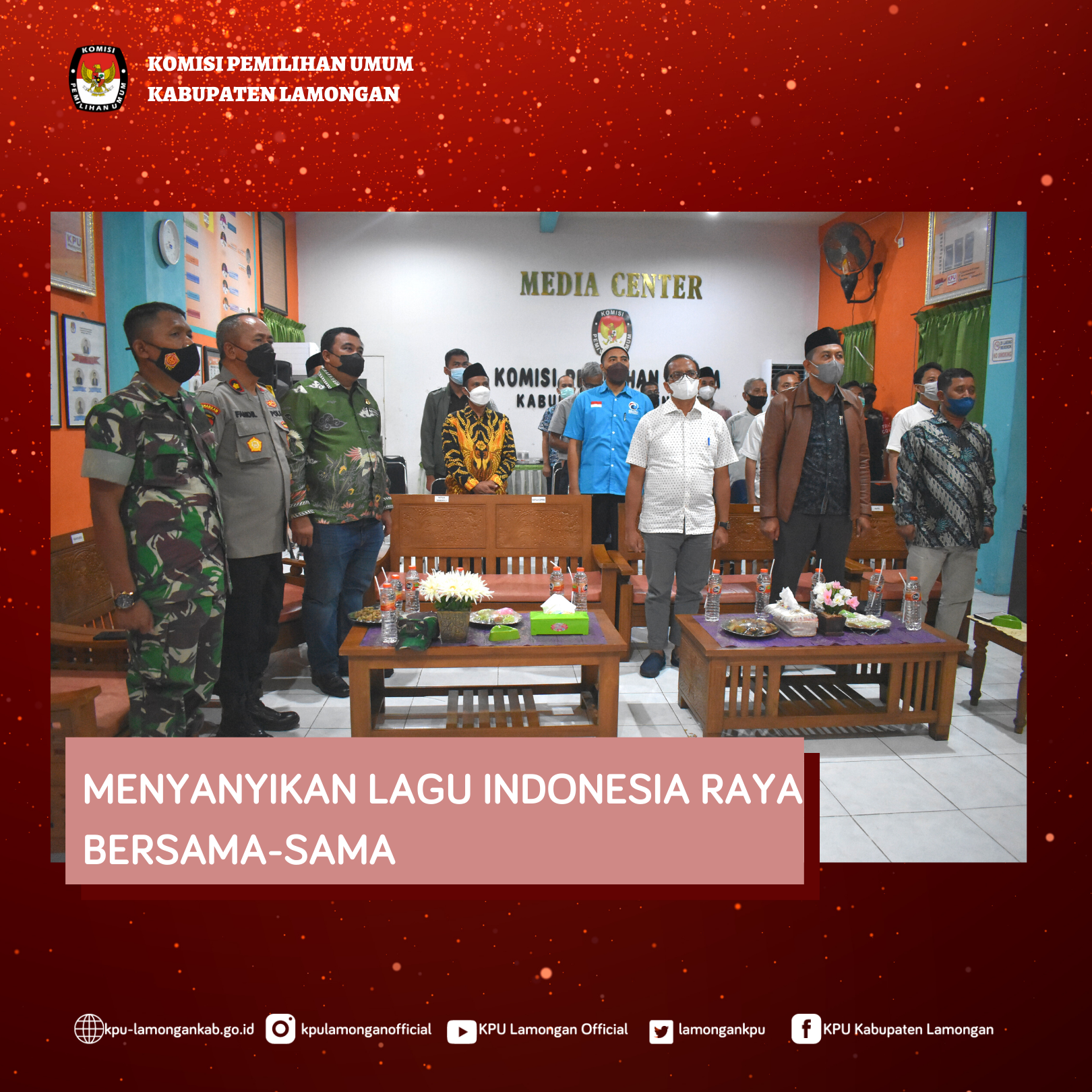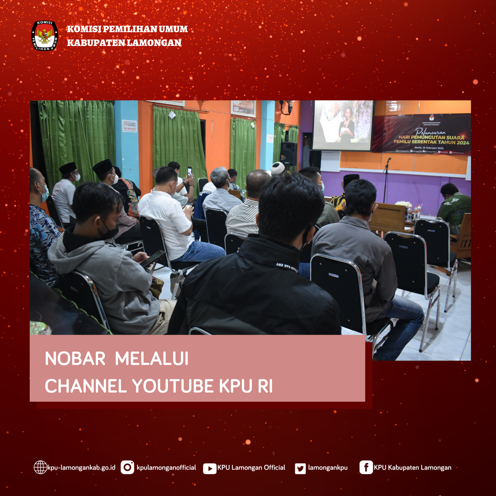 KPU Kabupaten Lamongan ikuti Proses Pelaksanaan Launching Hari Pemungutan Suara Pemilu Serentak Tahun 2024 di Media Center, Senin(14/02/2022). Kegiatan yang dilaksanakan pada jam 19.00-21.30 mengundang beberapa instansi pemerintah, Forkopimda dan Partai Politik. Peluncuran secara virtual melalui Kanal Youtube KPU RI ini sebagai bentuk sosialisasi masyarakat luas terkait Penetapan Tanggal Pemungutan Suara.