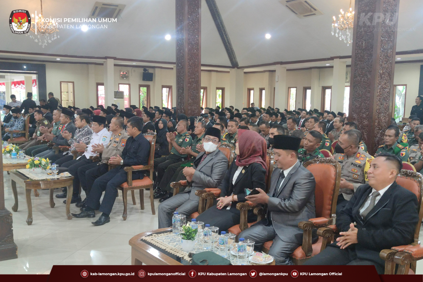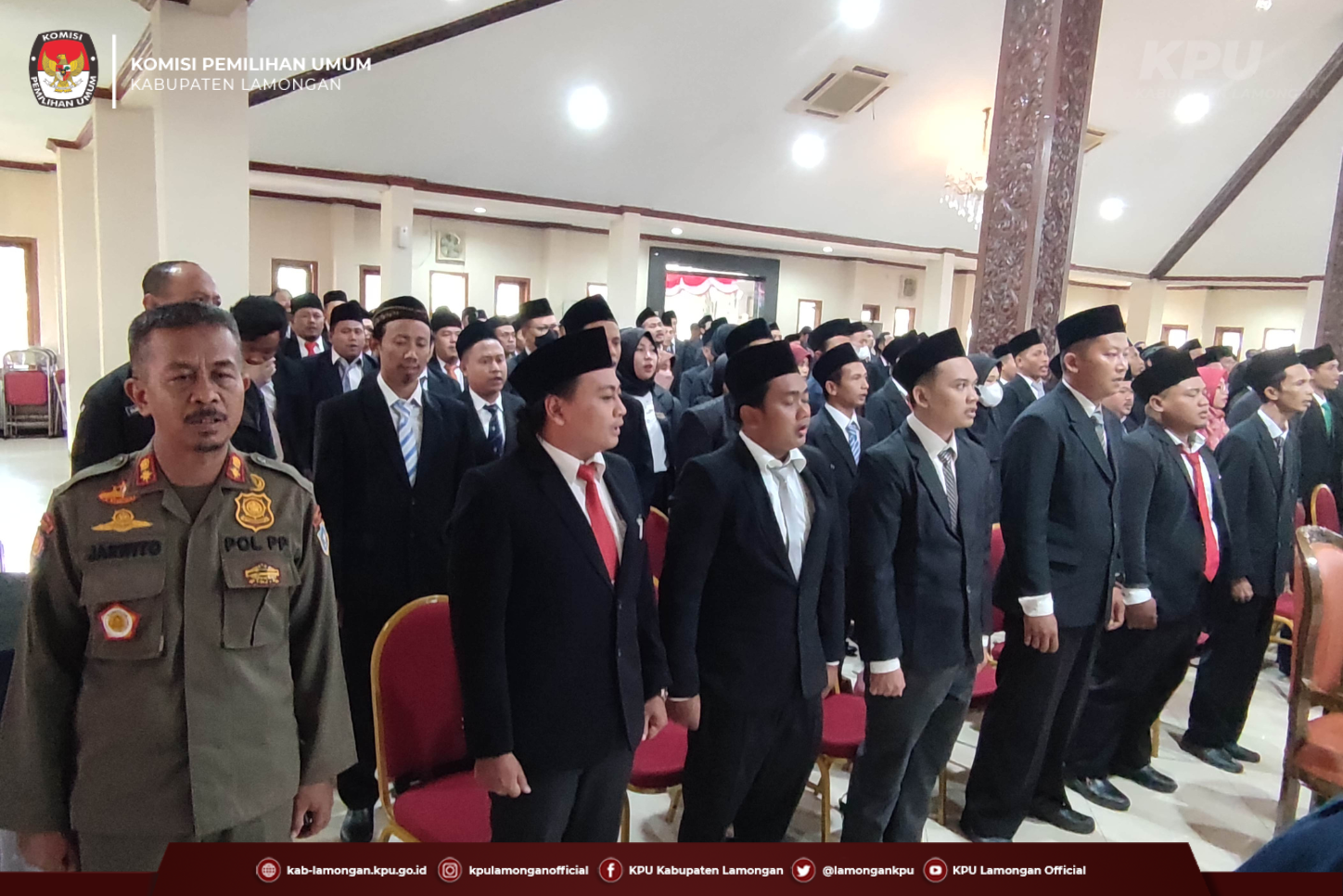 kab-lamongan.kpu.go.id Lamongan-Rabu(04/01/23), KPU Kabupaten Lamongan resmi melantik 135 Anggota PPK di Pendopo Lokatantra, Lamongan. Pelantikan ini dihadiri oleh Forkopimda Kabupaten Lamongan, yaitu Bupati dan Wakil Bupati, Kapolres, Dandim, Kajari, Ketua Pengadilan Negeri, atau yang mewakili. 135 Anggota PPK akan disebar ke 27 Kecamatan dengan komposisi 5 orang Anggota Per-Kecamatan.