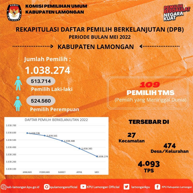 KPU Kabupaten Lamongan, telah melaksanakan Rekapitulasi Daftar Pemilih Berkelanjutan pada hari Senin (30/05/2022) bertempat di Kantor KPU Kabupaten Lamongan yang berlokasi di Jalan Basuki Rahmad Nomor 207, Lamongan. Hasil Rekapitulasi Daftar Pemilih Berkelanjutan bulan Mei 2022 tersebut tertuang dalam berita acara Nomor : 17/PL.01.2/3524/2022. Dengan jumlah Pemilih 1.038.274, dengan rincian laki-laki berjumlah 513.714 Pemilih, dan pemilih perempuan berjumlah 524.560 pemilih.