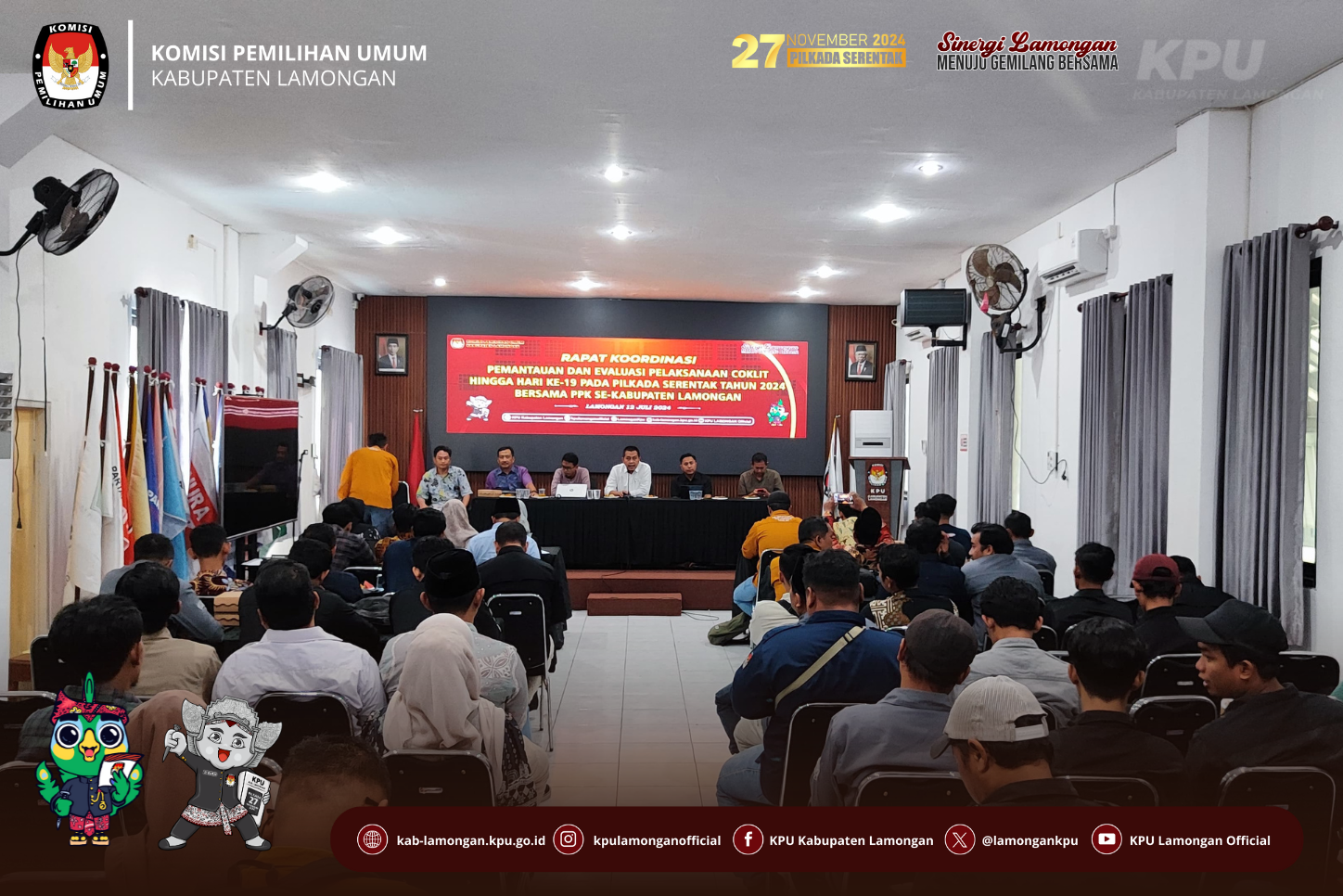 kab-lamongan.kpu.go.id Lamongan-KPU Kabupaten Lamongan gelar Rapat Koordinasi Pemantauan Dan Evaluasi Pelaksanaan Coklit Hingga Hari Ke-19 Pada Pilkada Serentak Tahun 2024, di Aula KPU Kabupaten Lamongan, Jumat (12/07/2024). Rapat ini dihadiri oleh Ketua, Divisi Data dan Divisi SDM Parmas PPK Se-Kabupaten Lamongan. Hadir juga pemateri dari pihak Disdukcapil.