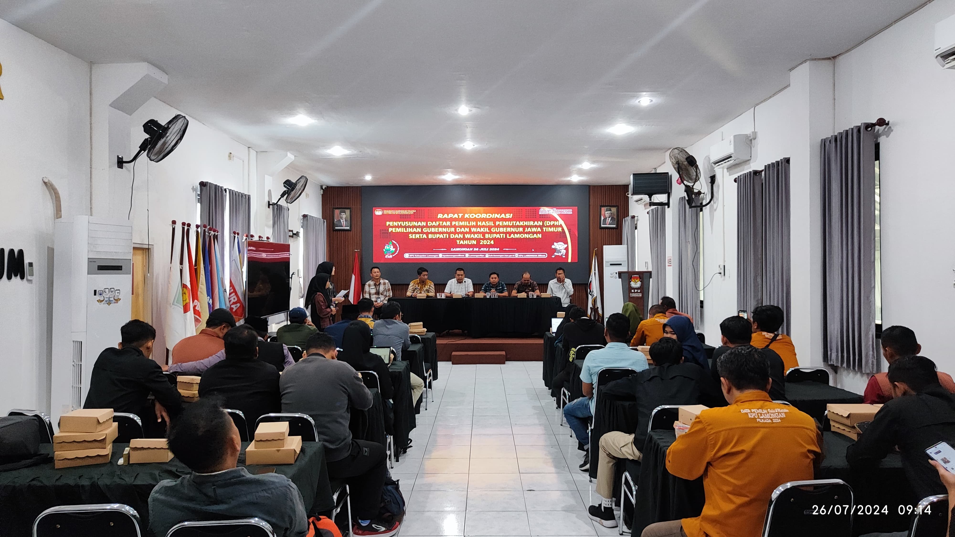 kab-lamongan.kpu.go.id Lamongan-Demi kelancaran Pemutakhiran Data Pemilih, KPU Lamongan gelar Rapat Koordinasi Penyusunan Daftar Pemilih Hasil Pemutakhiran (DPHP) di Aula KPU, Jum’at (26/07/2024). Rapat Koordinasi ini dihadiri oleh Panitia Pemilihan Kecamatan (PPK), yaitu Ketua dan Divisi Data. Hadir juga sebagai undangan Kepala Lembaga Pemasyarakatan IIB Lamongan dan Kepala Dinas Kependudukan dan Catatan Sipil Lamongan.