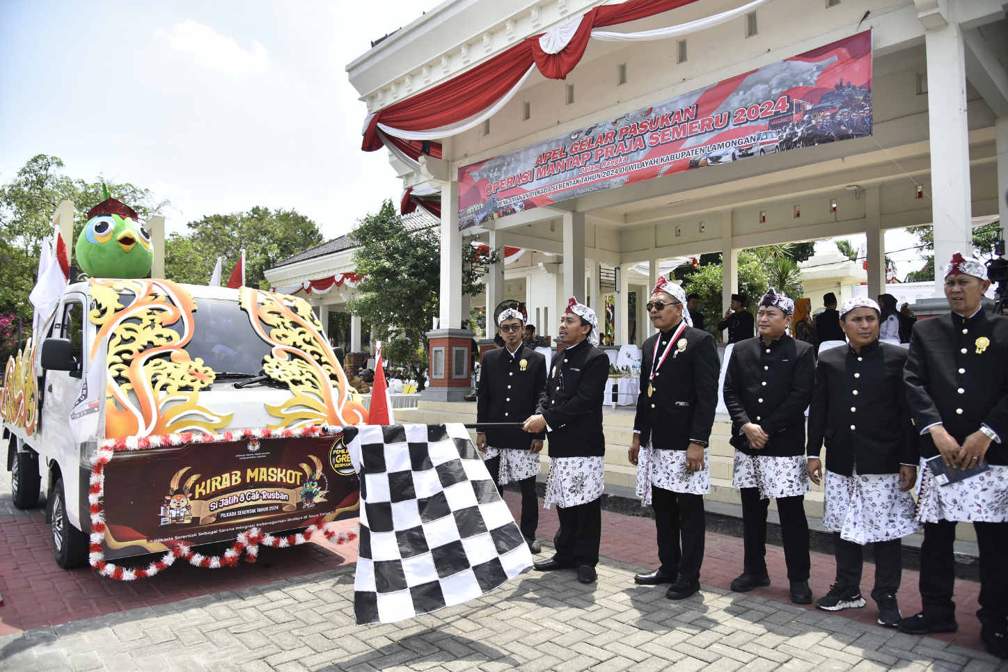 kab-lamongan.kpu.go.id Lamongan-Kamis (22/08/2024) KPU Kabupaten Lamongan menggelar Serah Terima Kirab Maskot Pilkada Serentak Tahun 2024 di Jawa Timur. Bertempat di Alun-Alun Lamongan, Rombongan Kirab KPU Kabupaten Gresik membawa Maskot Pilkada KPU Jatim “Si Jalih” (Jatim Memilih) dan Maskot KPU Gresik “Cak Rusban” (Rusa Bawean) untuk selanjutnya dikirabkan di Lamongan selama 3 hari kedepan. Acara ini digelar dengan meriah dengan pagelaran seni dan juga komitmen deklarasi oleh pemangku kepentingan di Kabupaten Lamongan.