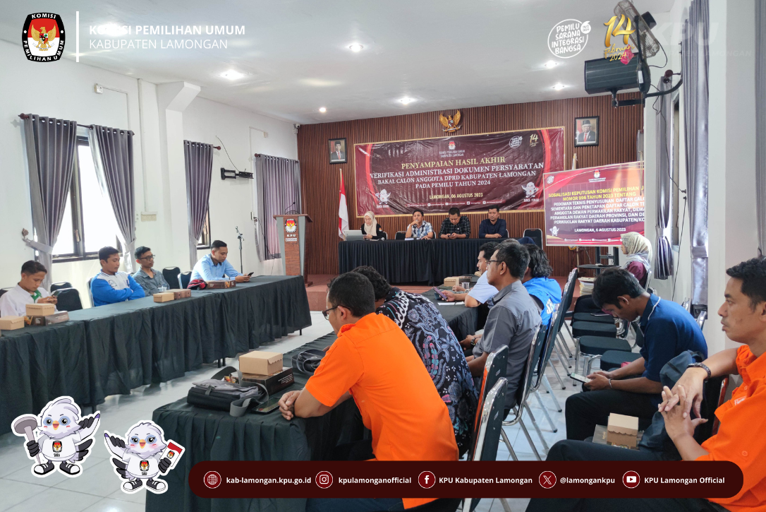 kab-lamongan.kpu.go.id Lamongan-Saat hari Minggu (06/08), Jam 11.00-12.00 WIB, KPU Kabupaten Lamongan tidak hanya melakukan Penyerahan Hasil Verifikasi Administrasi Dokumen Persyaratan Bakal Calon Anggota DPRD Kabupaten namun juga sosialisasi Keputusan KPU Nomor 996 Tahun 2023. Sosialisasi ini tentang tahapan Pencalonan yang selanjutnya yaitu Pedoman Teknis Penyusunan Daftar Calon Sementara dan Penetapan Daftar Calon Tetap Anggota Dewan Perwakilan Rakyat, Dewan Perwakilan Rakyat Daerah Provinsi, dan Dewan Perwakilan Rakyat Daerah Kabupaten/Kota.