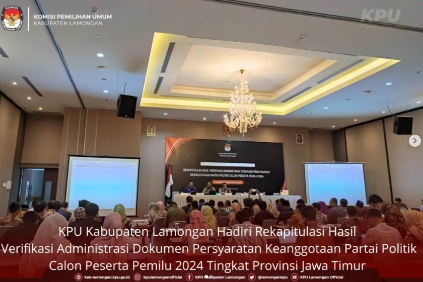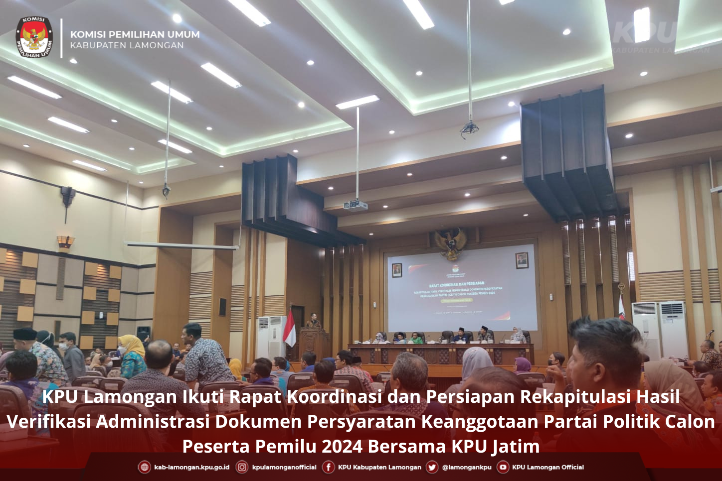 KPU Kabupaten Lamongan Hadiri Rapat Koordinasi dan Persiapan Rekapitulasi Hasil Verifikasi Administrasi Dokumen Persyaratan Keanggotaan Partai Politik Calon Peserta Pemilu 2024. Rakor yang dibuka di Gedung Paripurna DPRD Kab Malang ini diadakan oleh KPU Jatim, sabtu (10/9). Hadir sebagai Peserta Rakor Mahrus Ali, Ketua; Achmad Shohib, Divisi Teknis; Siswanto, Divisi Hukum; Emi Setiawati, Kasubbag Teknis; dan Indra Ikrimah, operator SIPOL KPU Kab Lamongan. Rakor ini bertujuan untuk Mempersiapkan Rekapitulasi yang dilakukan pada hari minggu dan senin(11-12/9). Ketua KPU Provinsi Jawa Timur, Choirul Anam memberikan arahan untuk menekankan kepada kabupaten/kota akan pentingnya pola kerja yang tersistem dan sinergisitas yang baik dalam penyelenggaraan tahapan Pemilu Tahun 2024. Menurut Anam, Ketua KPU Kabupaten/Kota bertanggung jawab dalam hal memastikan kedua hal tersebut baik pola kerja maupun sinergisitas terimplementasikan di kabupaten/kota.