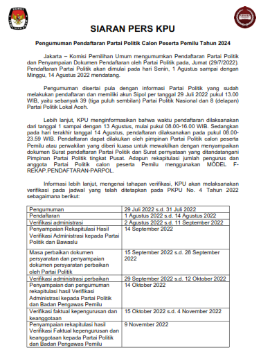 Selain itu Dewi Mashlahatul Ummah, Anggota Perencanaan, Data dan Informasi menyampaikan, saat ini yang perlu digaris bawahi adalah apa saja yang perlu disiapkan parpol di tingkat Kabupaten/Kota. "Saya tentu berharap verifikasi administrasi, pasal 35-36, terdapat klausul bahwa anggota partai politik harus terdaftar di Data Pemutakhiran Data Pemilih Berkelanjutan," jelasnya. Harapannya partai politik bisa mengecek Nama NIK dan elemen selainnya terdapat di data KPU.