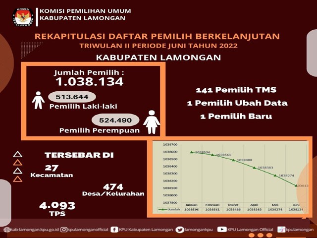 KPU Kabupaten Lamongan, pada hari Selasa (28/06/2022) telah melaksanakan Rekapitulasi Daftar Pemilih Berkelanjutan yang bertempat di Kantor KPU Kabupaten Lamongan beralamatkan Jl. Basuki Rahmad Nomor 207 Lamongan. Rapat Koordinasi Daftar Pemilih Berkelanjutan Triwulan II tahun 2022 di hadiri oleh Polres Lamongan, Kodim 0812 Lamongan, Bawaslu Kabupaten Lamongan, Dinas Kependudukan dan Catatan Sipil, Kabag Pemerintahan, Bakesbangpol, Dinas Komunikasi dan Informasi, Lembaga Pemasyarakatan Kelas IIB Lamongan, dan Partai Politik. Hasil Rekapitulasi Daftar Pemilih Berkelanjutan Triwulan II bulan Juni 2022 tersebut tertuang dalam berita acara Nomor : 20/PL.01.2/3524/2022. Dengan jumlah Pemilih 1.038.134, dengan rincian laki-laki berjumlah 513.644 Pemilih, dan pemilih perempuan berjumlah 524.490 pemilih.