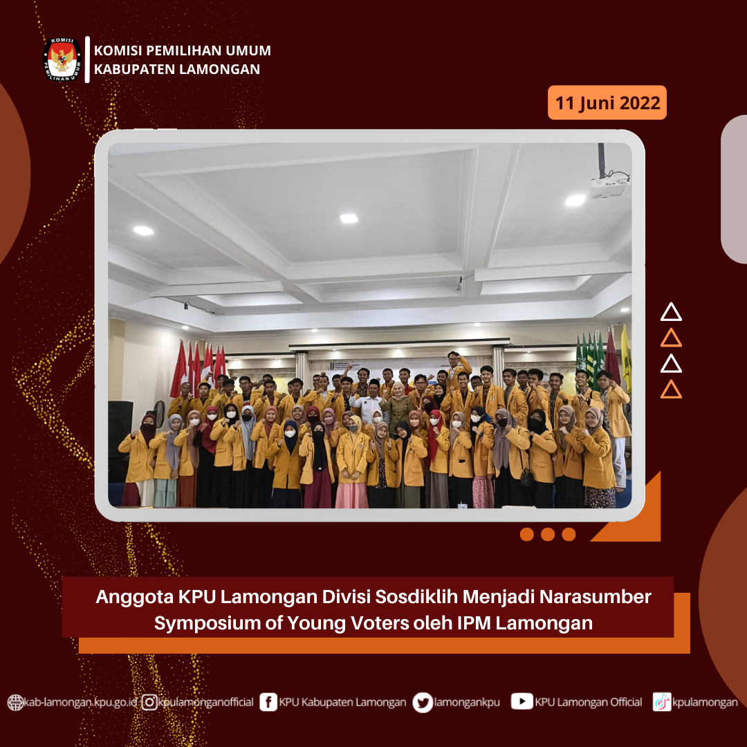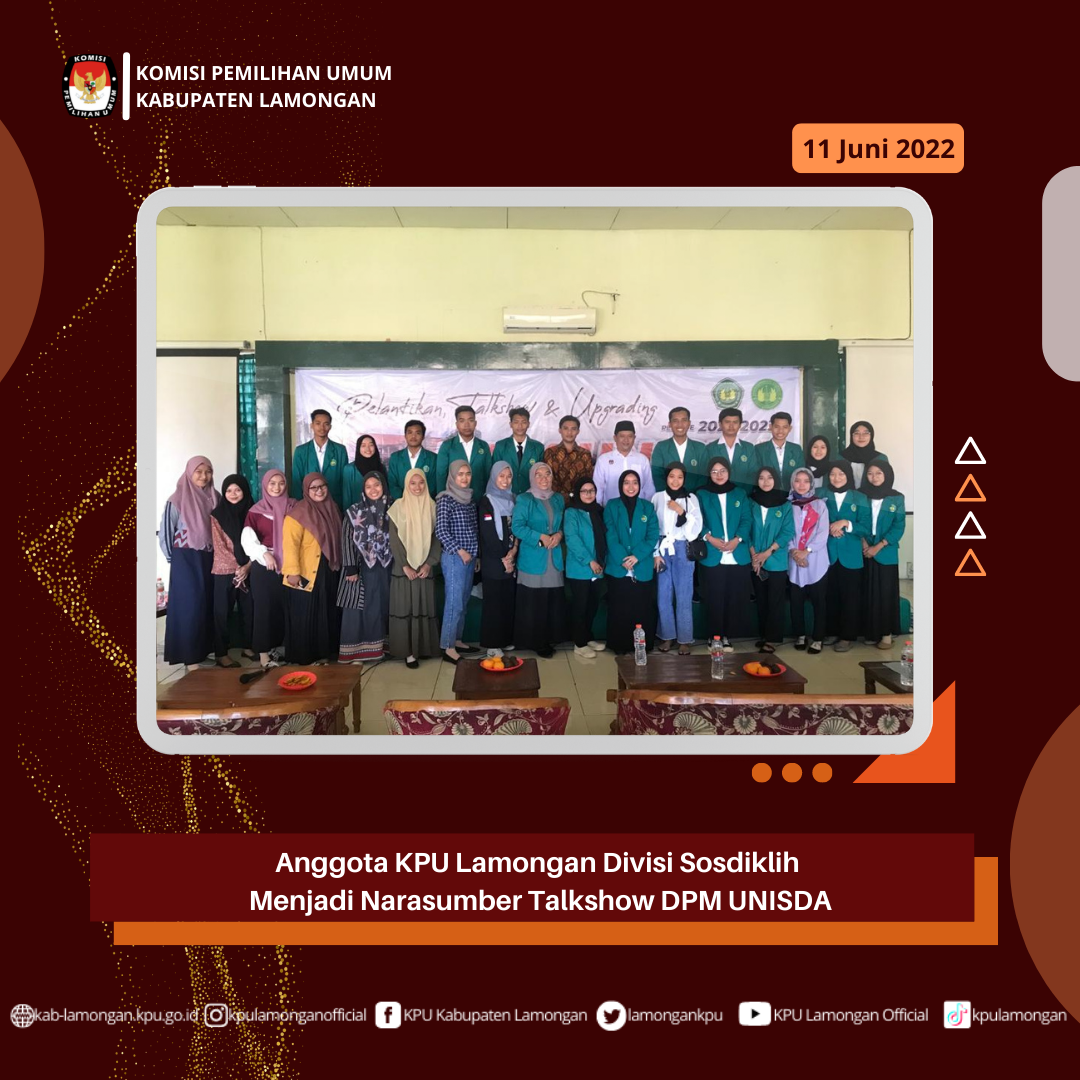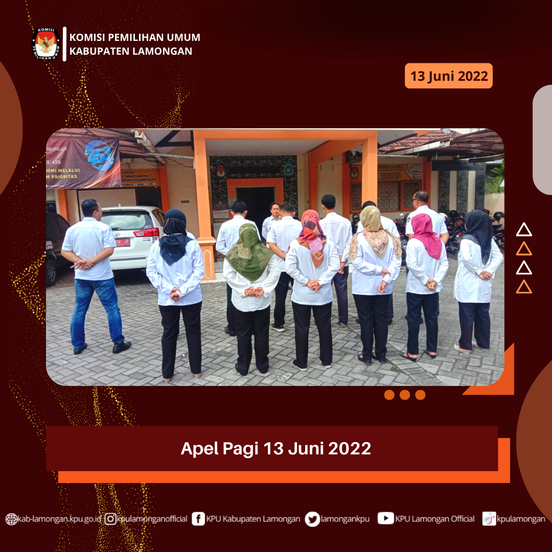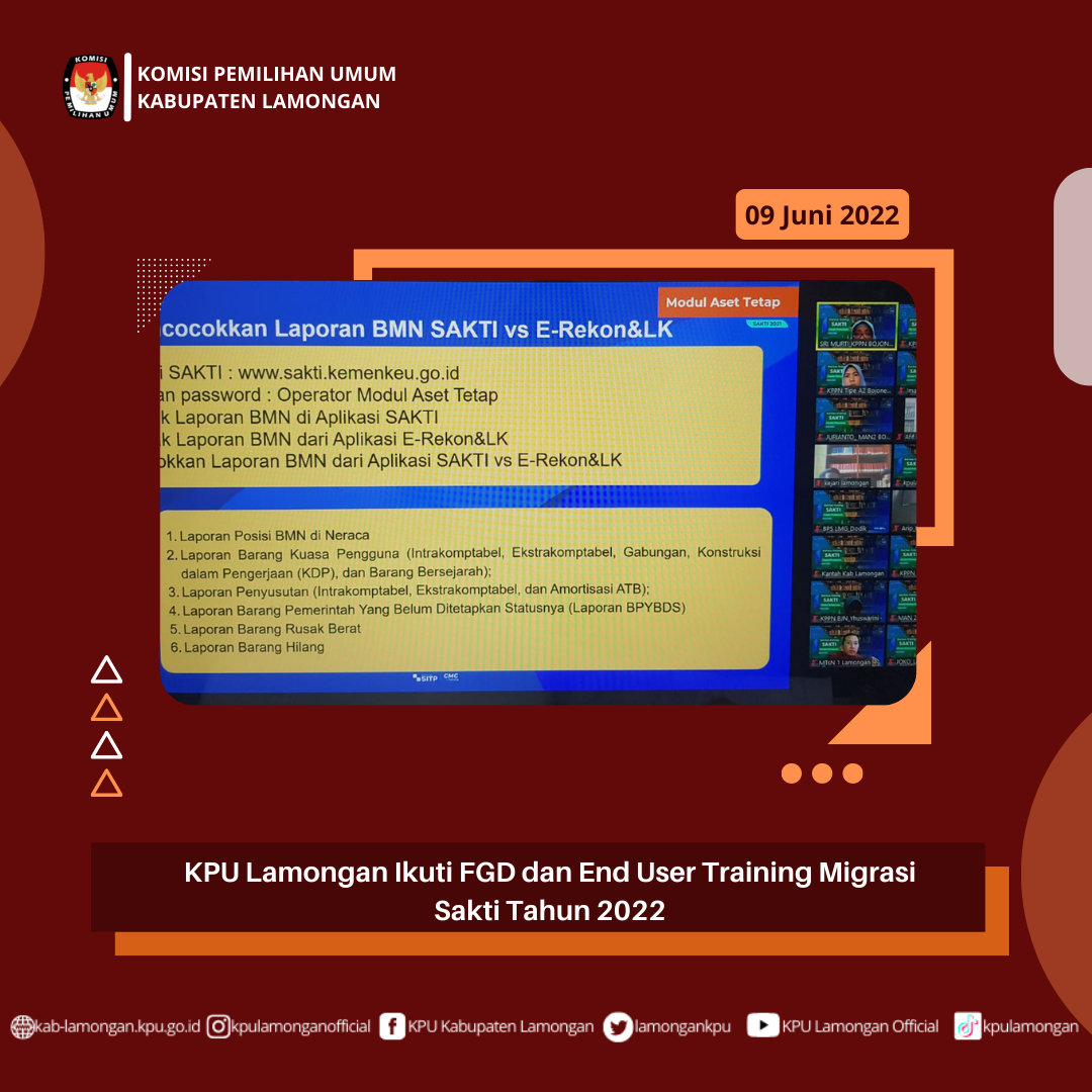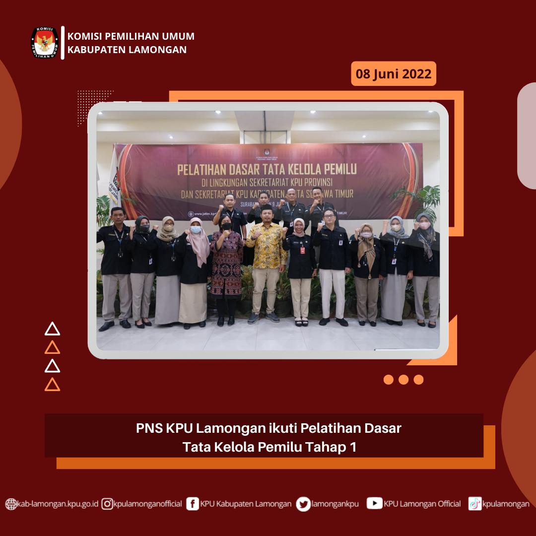 Selasa(9/6/2022) 11 PNS KPU Lamongan mengikuti Pelatihan Tata Kelola Pemilu bersama 245 ASN lainnya se-KPU Kab/kota dan Provinsi Jawa Timur pada jam 08.00-18.00. Pelatihan ini bertujuan untuk penguatan Wawasan dan Pendalaman Pemahaman PNS KPU demi menyongsong Tahapan pemilu 2024.
