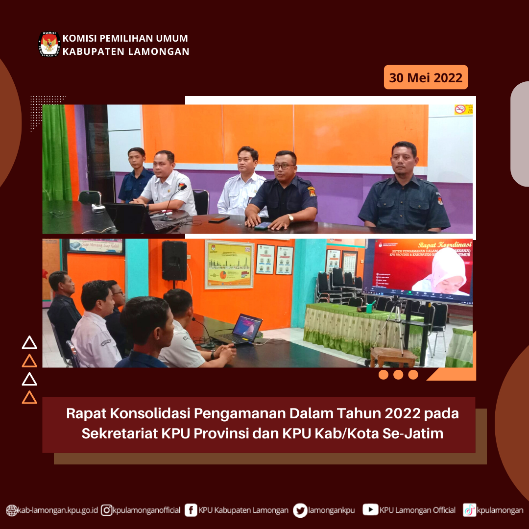 Lamongan,kab-lamongan.kpu.go.id- Sekretaris, Kasubbag Keuangan; Umum dan Logistik, dan 3 Petugas Keamanan ikuti Rapat Konsolidari Pengamanan yang diadakan oleh KPU Jatim pada hari Senin(30/05/2022). Rapat yang dilaksanakan pada jam 09.00-11.00 ini mengundang 38 KPU Kabupaten/Kota se-Jawa Timur. Membahas mengenai Sistem Pengamanan Jagat Saksana KPU Oleh Bagian Pengamanan Dalam KPU RI.