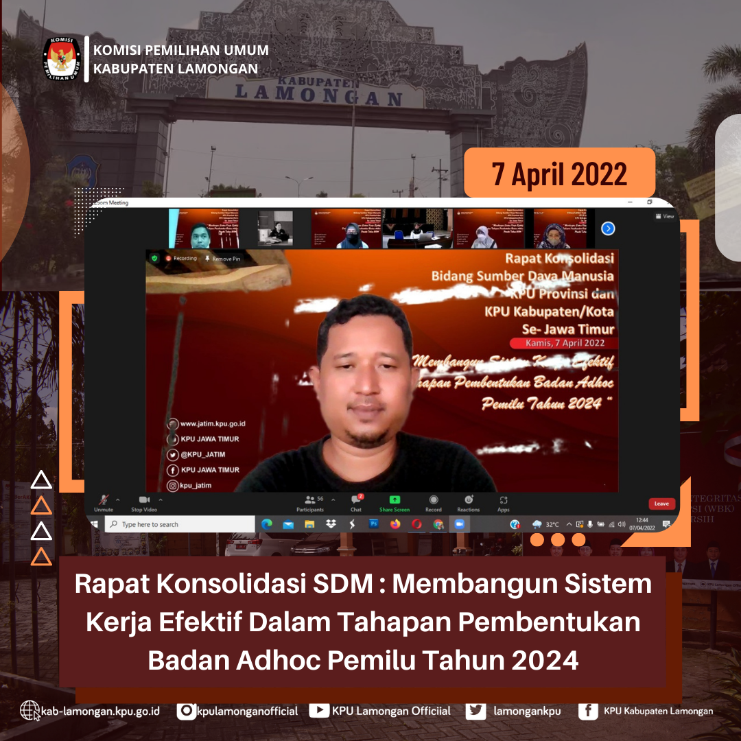 KPU Kabupaten Lamongan, Divisi Sosdiklih, Parmas dan SDM, Khoirul Anam dan Kasubbag Hukum dan SDM, Sujai, mengikuti Rapat Konsolidasi SDM bertemakan Membangun Sistem Kerja Efektif Dalam Tahapan Pembentukan Badan Adhoc Pemilu Tahun 2024.