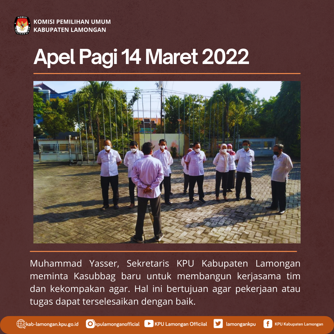Senin pagi, (14/03/2022) segenap jajaran KPU Kabupaten Lamongan melakukan Apel Pagi yang dipimpin oleh Sekretaris, M Yasser. Apel yang dilaksanakan pada jam 08.00 di media center ini membahas harapan terhadap Kepala Sub Bagian (Kasubbag) baru.