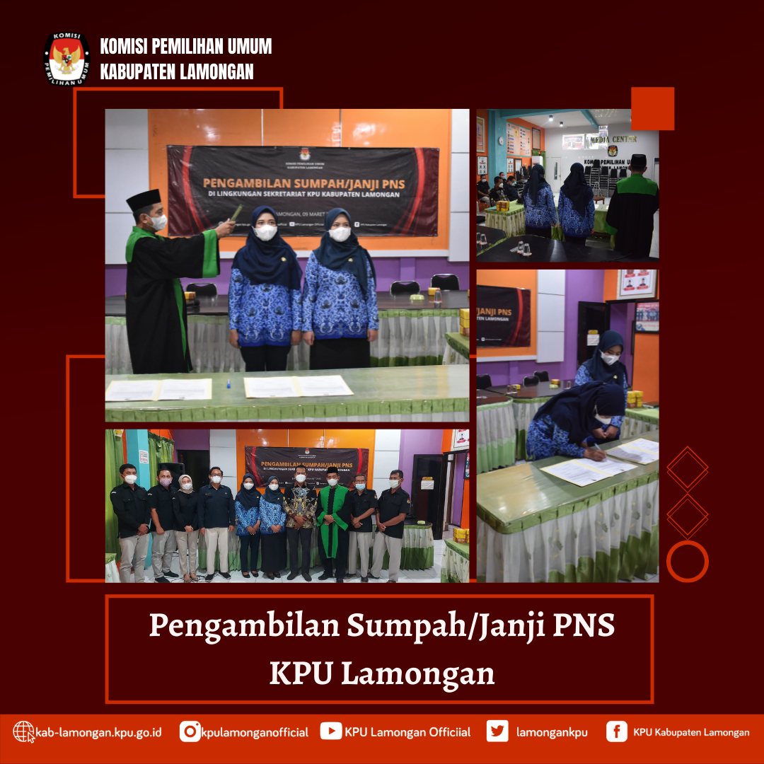 Pengambilan Sumpah/Janji PNS dilaksanakan secara serentak KPU Kab/Kota Se-Jawa Timur. Total pegawai yang diambil sumpahnya ada 58 orang. 2 pegawai KPU Lamongan mengikuti prosesi tersebut. Kegiatan ini disaksikan oleh Ketua, Sekretaris dan Kasubbag KPU Lamongan. Adanya pengambilan sumpah, maka secara sah dan resmi para CPNS sudah diangkat menjadi PNS.Pengambilan Sumpah/Janji PNS.
