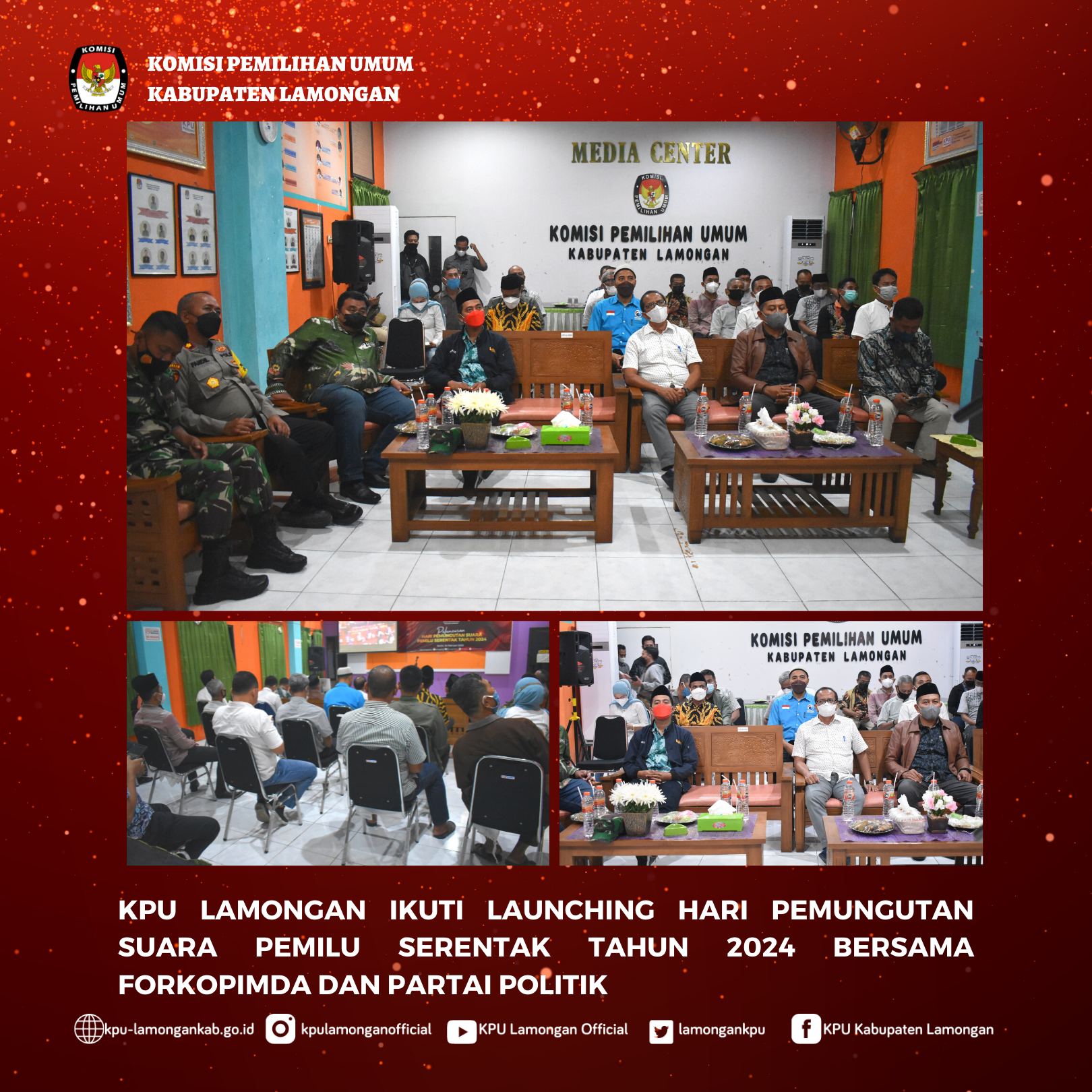 KPU Kabupaten Lamongan ikuti Proses Pelaksanaan Launching Hari Pemungutan Suara Pemilu Serentak Tahun 2024 di Media Center, Senin(14/02/2022). Kegiatan yang dilaksanakan pada jam 19.00-21.30 mengundang beberapa instansi pemerintah, Forkopimda dan Partai Politik. Peluncuran secara virtual melalui Kanal Youtube KPU RI ini sebagai bentuk sosialisasi masyarakat luas terkait Penetapan Tanggal Pemungutan Suara.