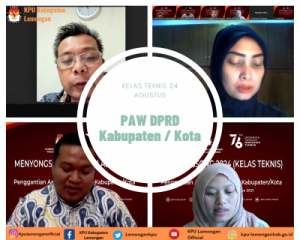 Lamongan-KPU Kabupaten Lamongan kembali mengikuti Kelas Teknis pada Selasa, (24/08/2021). Tema kali ini tentang Pergantian Antar Waktu DPRD Kabupaten/Kota. Kelas Teknis dimulai seperti biasa, yaitu jam 10.00 hingga jam 13.00.