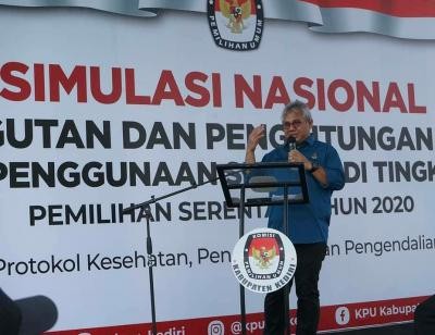 Sambutan Ketua KPU RI, Arif Budiman KEDIRI, Komisi Pemilihan Umum Kabupaten Lamongan menghadiri Simulasi Pemungutan dan Penghitungan (Pungut Hitung) Suara serta Penggunaan Aplikasi SIREKAP di Tempat pemungutan Suara (TPS) dalam Pemilihan Serentak Lanjutan Tahun 2020 hari ini, Sabtu (31/10). Simulasi dimulai dari pukul 07.00 WIB, dilaksanakan di halaman kantor KPU Kabupaten Kediri. Acara dihadiri oleh Ketua KPU RI, Ketua dan Anggota KPU Provinsi Jawa Timur, Komisioner Bawaslu Provinsi Jawa Timur, serta KPU Kabupaten/ Kota di Jawa Timur, KPU Provinsi dan Kabupaten/ Kota penyelenggara Pemilihan Serentak Lanjutan tahun 2020. Ketua KPU RI, Arief Budiman dalam sambutannya juga meyakinkan masyarakat bahwa pemungutan, penghitungan, serta rekapitulasi suara Pemilihan Serentak Tahun 2020 tanggal 9 Desember nanti aman bagi pemilih maupun penyelenggara. Ninik Sunarmi, Ketua KPU Kabupaten Kediri dalam sambutannya menyampaikan bahwa acara simulasi ini dilaksanakan sebagai gambaran dalam melaksanakan Pemungutan dan Penghitungan Suara yang aman di tengah pandemi dalam Pemilihan Serentak Lanjutan Tahun 2020. Diharapkan dengan simulasi seperti ini nantinya para penyelenggara yang ada di tiap kabupaten kota di Jawa Timur yang mengadakan pemilihan serentak lanjutan dapat menggelar pemilihan dengan bagus terutama di kabupaten Lamongan, ujar Mahrus Ali Ketua KPU Kabupaten Lamongan.