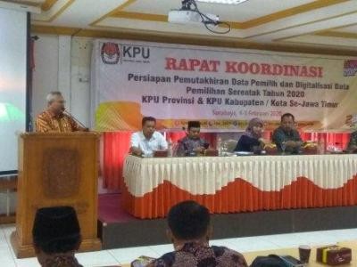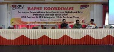 Dalam rangka persiapan Pemutakhiran Data Pemilih dalam Penyelenggaraan Pemilihan Tahun 2020, KPU Provinsi Jawa Timur gelar Rapat Koordinasi Persiapan Pemutakhiran Data Pemilih dan Digitalisasi Data bersama 19 KPU Kabupaten/Kota di Jawa Timur. di Kantor KPU Provinsi Jawa Timur, Surabaya.