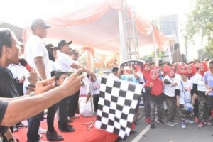 Para peserta KPU Run di lepas oleh Bupati Lamongan, H.Fadeli beserta Wakil Bupati Lamongan Hj.Kartika Hidayati dan juga ketua KPU kabupaten Lamongan Imam Ghozali berserta Komisioner lainnya.