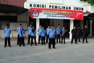 Ditengah kesibukan kegiatan memperingati HUT RI ke 71, KPU Kab. Lamongan tetap menggelar kegiatan Ngaji Kamisan. Kegiatan ini dilaksanakan di ruang media centre dan diikuti oleh seluruh komisioner dan pegawai kesekretarian di lingkungan KPU Kabupaten lamongan. Materi Ngaji Kamisan masih tetap melanjutkan bedah UU no. 10 tahun 2016. Kegiatan Ngaji Kamisan dipandu oleh bu Nikmah, Kasubag Hukum dan SDM dengan pemateri Bapak Siswanto selaku anggota KPU Kab. Lamongan yang membidangi divisi Hukum. Oleh Bapak Siswanto, materi difokuskan pada bab Pencalonan. Diskusi berlangsung gayeng diwarnai adu argumen, serta sesekali diselingi celtukan guyonan dari peserta. Para peserta tampak antusias menannyakan beberapa hal yang dirasa kurang paham. Pemateri juga nampak sigap memberikan penjelasan sesekali para komisioner yang lain juga menimpali memberikan penjelasan tambahan dan penekanan beberapa aspek tentang pencalonan. Kegitan Ngaji Kamisan ditutup oleh Imam Ghozali, Ketua KPU Kab. Lamongan. Dalam sambutan penutupannya, Imam menyampaikan apresiasi atas berlangsungnya kegitan Ngaji Kamisan kali ini dan menyampaikan terima kasih atas partisipasi yang cukup luar biasa dari peserta. “Kegiatan Ngaji Kamisan merupakan keputusan Pleno, karenanya wajib didukung oleh semua pihak dan secara konsisten terus dilaksanakan”, tekan Imam sebelum mengakhiri sambutannya./ftr