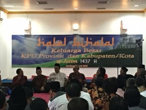 Agenda Kegiatan disela-sela aktifitas perkantoran di lingkungan KPU Kabupaten Lamongan diadakan acara Halal Bihalal (HBH) sebagai media mempererat rasa kekeluargaan dan penguatan kelembagaan. Acara HBH ini berjalan dengan khidmat yang dipandu oleh Sekretaris KPU Kabupaten Lamongan, Muhajir. Dalam sambutan yang disampaikan oleh Ketua KPU Kabupaten Lamongan, Imam Ghozali menyampaikan, “acara HBH ini adalah media untuk mempererat tali silaturahmi kita, penguatan kelembagaan kita yang harus selalu kita jaga dengan sepenuh hati untuk menjalankan tugas di perkantoran KPU Kabupaten Lamongan.Kita memiliki komitmen untuk menunjukkan kepada publik dan masyarakat bahwa kita bekerja dengan sepenuh waktu dan menjalankan tugas ini dengan penuh tanggung jawab, profesional, berintegritas dan yang paling penting kita harus bertanggung jawab dalam tugas-tugas kita. Kita juga panjatkan Do’a untuk almarhum Pak Husni, semoga beliau ditempatkan di sisi Allah SWT pada tempat yang istimewa, ujarnya dalam sambutan pada acara HBH ini. Kegiatan ini dilaksanakan setelah kegiatan senam pagi bersama di halaman kantor KPU Kabupaten Lamongan yang diikuti oleh seluruh jajaran keluarga besar KPU Kabupaten Lamongan diruangan Media Center./ftr