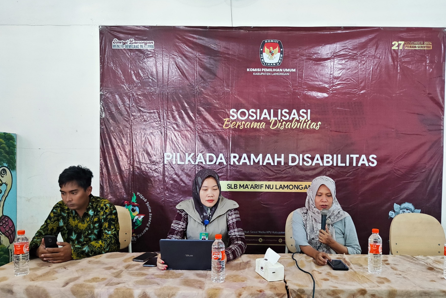 kab-lamongan.kpu.go.id Lamongan- KPU Kabupaten Lamongan melaksanakan sosialisasi bersama disabilitas, pada hari Jumat (30/08/2024), di SLB Ma'arif NU, Dusun Pule, Desa, Sekargeneng, Bakalanpule, Kec. Tikung, Kabupaten Lamongan. Hadir sebagai narasumber Yaitu Dewi Mashlahatul Ummah, Anggota KPU Lamongan periode 2014-2019 dan 2019-2024 serta Arodhi, Kepala Sekolah SLB Maarif NU.