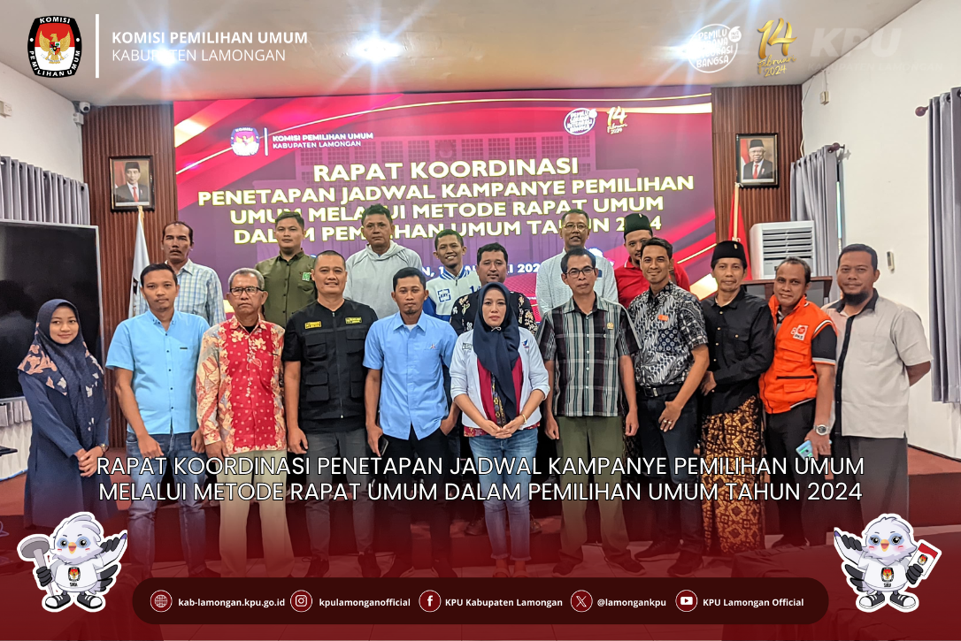 Lamongan (kab-lamongan.kpu.go.id)- KPU Kabupaten Lamongan melaksanakan Rapat Koordinasi Penetapan Jadwal Kampanye Pemilihan Umum Melalui Metode Rapat Umum Dalam Pemilihan Umum Tahun 2024, pada hari Jumat (19/01/23), di Aula KPU, pada jam 15.00-16.30 WIB. Pada kesempatan ini, Siswanto, Divisi Hukum dan Pengawasan, menyampaikan sesuai dengan pasal 49 ayat 2, KPU Kabupaten/Kota menetapkan jadwal Kampanye Pemilihan Umum setelah mendengarkan masukan dan tanggapan dari Pelaksana Kampanye Pemilu. KPU mengundang 18 Partai Politik Pelaksana Kampanye. Siswanto menyampaikan bahwa jadwal kampanye telah tertuang pada Keputusan 78 Tahun 2024. Hari ini adalah tugas KPU menyampaikan Kpt tersebut sekaligus menerima masukan dari Pelaksana Kampanye. Khoirul Anam, Divisi Sosdiklih, SDM, dan Parmas, menyampaikan bahwa Lamongan masuk dalam Zona C, Jawa Timur. Akhirnya Jadwal Rapat Umum sama dengan Kab/Kota se-Jawa Timur dengan interval selama 1 hari. Besok (red:20/01/23) juga akan keluar Keputusan KPU tentang Jadwal Rapat Umum di Lamongan.