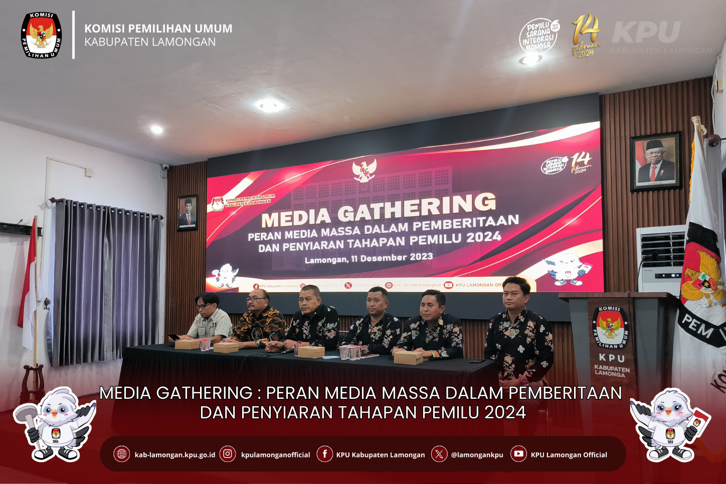 Lamongan (kab-lamongan.kpu.go.id) -KPU Lamongan menggelar Media Gathering dalam publikasi dan pemberitaan Pemilu 2024, pada hari senin (11/12/20223), di Aula, pada jam 11.00-13.00 WIB. Hadir berbagai jurnalis media elektronik, media cetak maupun media online. Mahrus Ali, Ketua KPU Lamongan, dalam sambutannya menyampaikan pentingnya Peran Media Massa dalam menyebarkan Informasi terkait pelaksanaan pemilu. Media merupakan salah satu stakeholder demi suksesnya Pemilu 2024. Mahrus berharap ada sinergitas kedepannya antara KPU dan Media. Khoirul Anam, Divisi Sosialisasi Pendidikan Pemilih, SDM dan Parmas berharap agar media dapat menyampaikan berita yang bisa meningkatkan partisipasi Masyarakat. Dalam kesempatan ini materi disampaikan oleh Ketua Persatuan Wartawan Indonesia (PWI) Lamongan, Kadam Mustoko dan Ikatan Jurnalis Televisi Indonesia (IJTI) Lamongan, yaitu Abdul Wakhid Nurul Yakin. Materi yang disampaikan adalah Peran Media Massa dalam memproduksi berita yang positif dan Jurnalisme Positif.