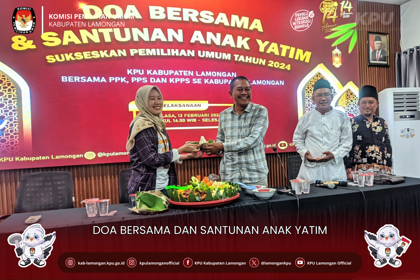 Lamongan (kab-lamongan.kpu.go.id)-KPU Lamongan laksanakan Doa Bersama dan Santunan Anak Yatim pada hari Selasa (13/02/2024), tepat H-1 Sebelum Pemilu besok tanggal 14 Februari 2024. Mahrus Ali, Ketua KPU Lamongan, menyampaikan bahwa setelah berbagai tahapan yang telahbkota laksanakan, KPU melaksanakan doa bersama dan santunan kepada anak yatim agar tahapan puncak saat pencoblosan dan pemilihan berjalan dengan lancar. Setiap Tahapan Pra Pemungutan Suara sudah dijalani, yaitu Pendaftaran Partai Politik, Pencalonan, Sosialisasi, Kampanye hingga Distribusi Logistik. Selain Doa Bersama, KPU Lamongan juga melaksanakan Santunan kepada Anak Yatim di Sekitar KPU Lamongan. Acara doa bersama ini juga diikuti serentak dilokasi masing-masing oleh PPK, PPS dan KPPS Se-Kabupaten Lamongan melalui media daring yaitu Live Youtube. Semoga doa yang dilakukan hingga tingkatan ke bawah ini merupakan ikhtiar batin atau sarana untuk meminta pertolongan kepada Tuhan, agar hajatan Pemilu 2024 berjalan damai dan kondusif sesuai aturan yang berlaku. Mahrus juga mengajak dan mengingatkan kembali kepada masyarakat agar menggunakan Hak Pilihnya pada tanggal 14 Februari 2024 di lokasi TPS masing-masing sesuai yang ada di C Pemberitahuan atau Cekdptonline.