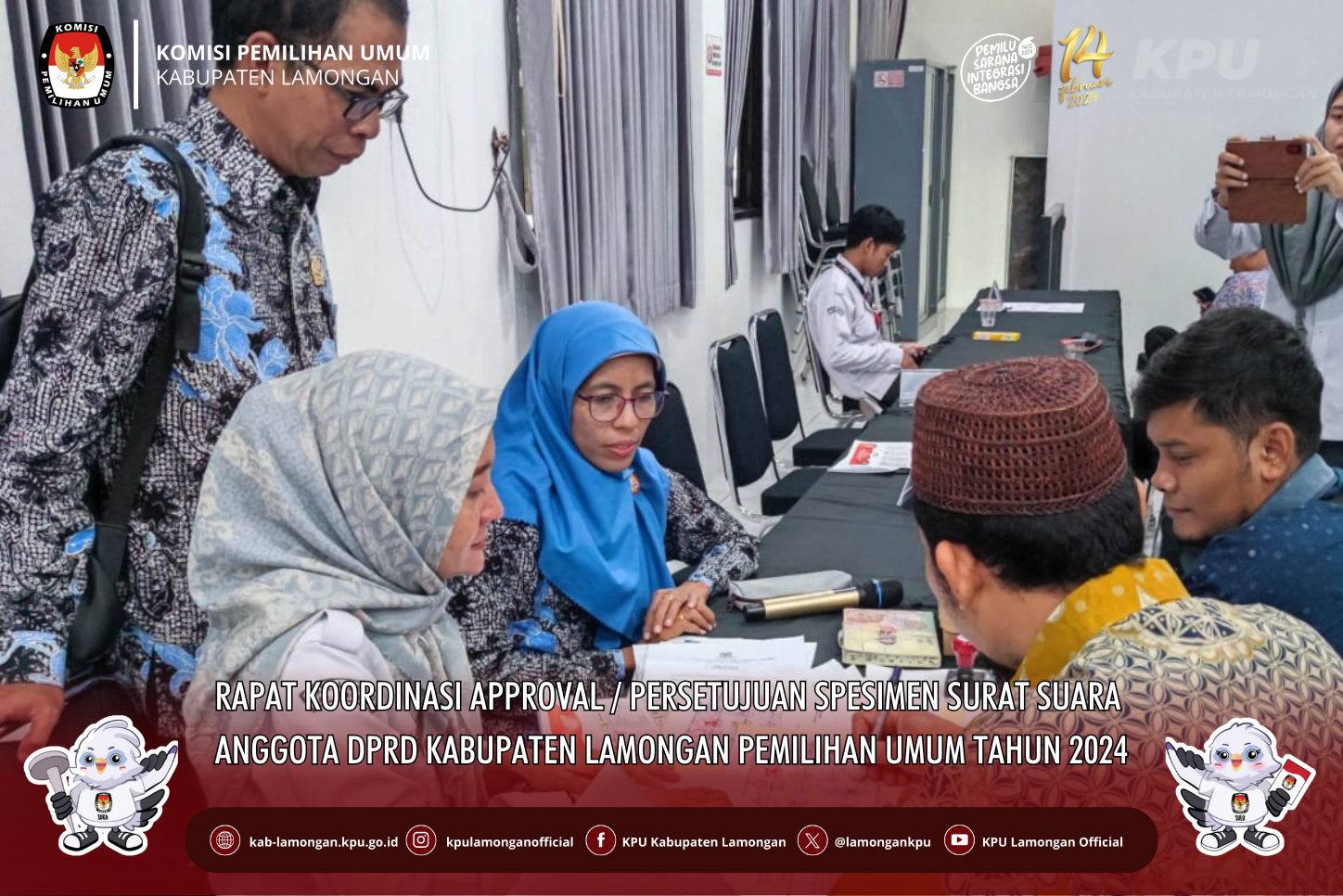 kab-lamongan.kpu.go.id Lamongan-KPU Kabupaten Lamongan menyelenggarakan Rapat Koordinasi Approval atau Persetujuan Spesimen Surat Suara Anggota DPRD Kabupaten Lamongan, pada hari Kamis (02/11/2023). Hadir dalam kegiatan, Partai Politik dan Bawaslu Kabupaten Lamongan. Dalam proses persetujuan Rancangan Surat Suara, Achmad Shohib, Divisi Teknis Penyelenggaraan, menjelaskan bahwa KPU menampilkan rancangan surat suara yang telah dilengkapi nama calon, foto dan gelar calon legislatif. Kemudian, partai politik diminta memeriksa kembali dan memberikan paraf jika tidak ditemukan adanya kesalahan. Achmad Shohib mengingatkan kepada Ketua Partai Politik dan atau LO tingkat Kabupaten Lamongan untuk meneliti elemen identitas dalam surat suara tersebut. “Jangan sampai ada perbedaan gelar, huruf, tanda baca, hingga foto calon Anggota Legislatif,” tutur Shohib. Partai Politik menandatangani 5 lembar Rancangan Surat Suara sesuai dengan Jumlah Daerah Pemilihan (DAPIL) Kabupaten Lamongan untuk Pemilu 2024.