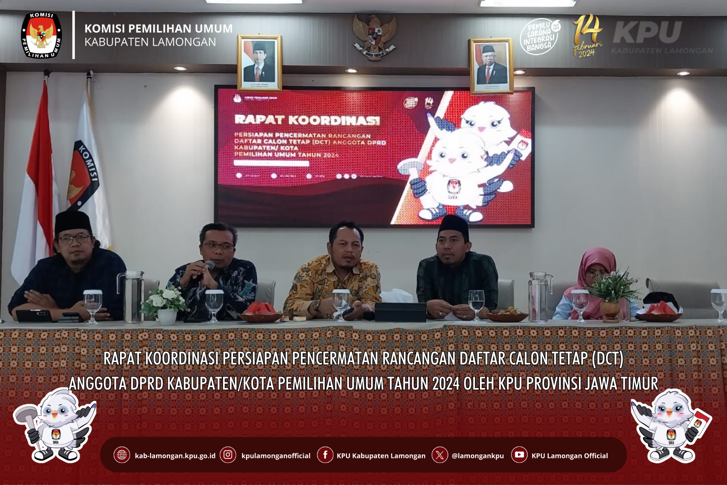 kab-lamongan.kpu.go.id Lamongan-Pada hari jumat dan sabtu (22-23/9), KPU Jatim menyelenggarakan Rapat Koordinasi Persiapan Pencermatan Rancangan Daftar Calon Tetap (DCT) Anggota DPRD Kabupaten/Kota Pemilihan Umum Tahun 2024 bersama dengan 38 perwakilan Anggota KPU Kabupaten/Kota se-Jawa Timur. Acara berlangsung di Kantor KPU Kota Pasuruan, Jl. Panglima Sudirman No.119 A pukul 15.30 sampai dengan selesai. Tujuan diadakannya rapat ini sebagai upaya mencapai penetapan DCT yang bebas dari sengketa dan menargetkan rampungnya DCT pada tingkat Kabupaten/Kota. Beberapa tahapan sebelum tahapan penetapan DCT yakni proses Pencermatan Rancangan DCT, Verifikasi Administrasi Dokumen Persyaratan Calon Sementara Hasil Pencermatan Rancangan DCT, Rekapitulasi Hasil Verifikasi Administrasi terhadap Penggantian Calon, Penyusunan, Penetapan, dan Pengumuman DCT. Hadir dalam rapat, Achmad Shohib, Divisi Teknis Penyelenggaraan dan Emi Setiawati, Kasubbag Teknis Penyelenggaraan, Parmas dan Hubmas, KPU Kabupaten Lamongan.