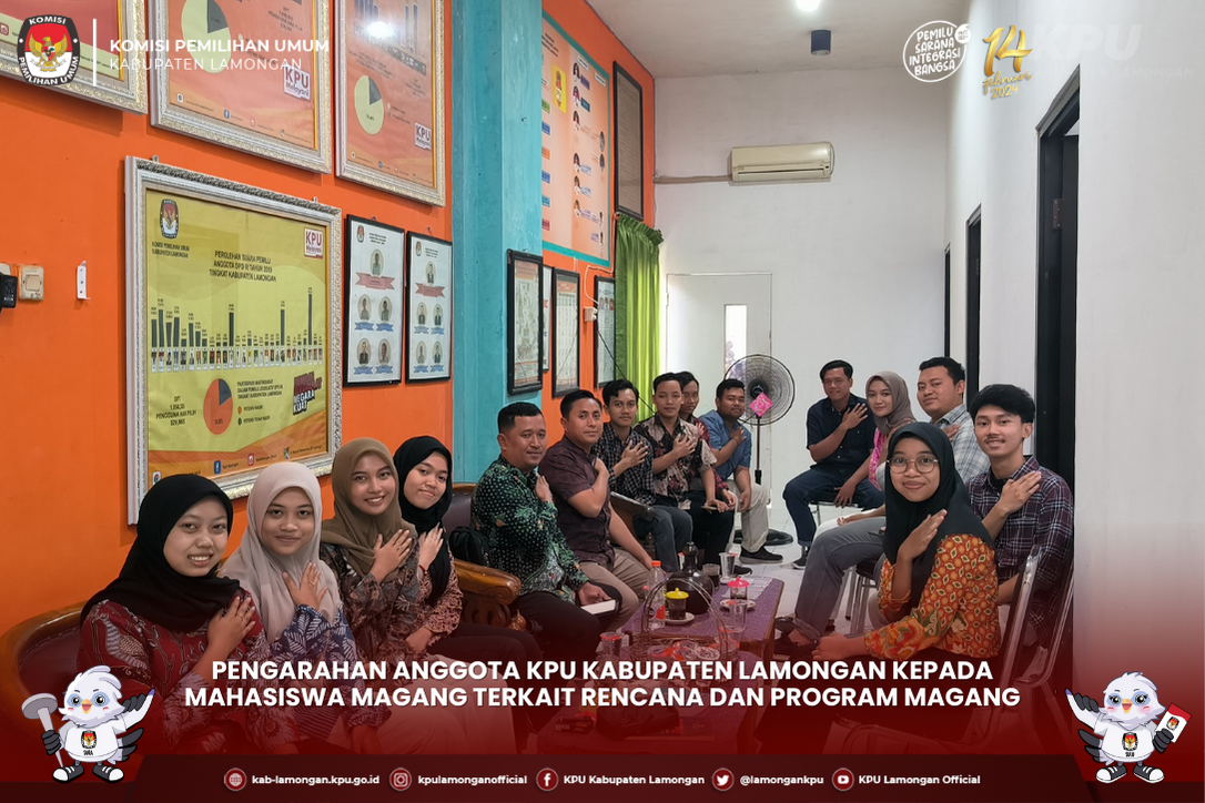 kab-lamongan.kpu.go.id Lamongan- KPU Kabupaten Lamongan; Khoirul Anam dan Achmad Shohib memanggil mahasiswa magang sejumlah 13 orang. Mahasiswa magang berkumpul di ruang jajaran Anggota KPU dalam rangka menerima arahan mengenai kegiatan atau program yang dapat dilakukan oleh mahasiswa magang kedepannya. Mahasiswa magang terdiri dari 7 Orang Universitas Pembangunan Nasional “Veteran” Jawa Timur (UPNVJT), 4 Orang Universitas Islam Lamongan (UNISLA), dan 2 Orang Universitas Airlangga (UNAIR) untuk berkumpul di ruang Jajaran Anggota KPU Kabupaten Lamongan. Hal ini dilakukan oleh Anam dan Shohib karena ingin mengetahui tujuan para peserta magang. Pemanggilan ini bertujuan supaya KPU dapat memfasilitasi sesuai dengan jurusan serta kemampuan para peserta magang. Pengarahan ini dilakukan oleh Khoirul Anam dan Ahmad Shohib dengan harapan supaya peserta magang mendapatkan banyak ilmu dari kegiatan magang. Anam berharap magang di KPU dapat menambah bekal ilmu, pengalaman dan keahlian mahasiswa.