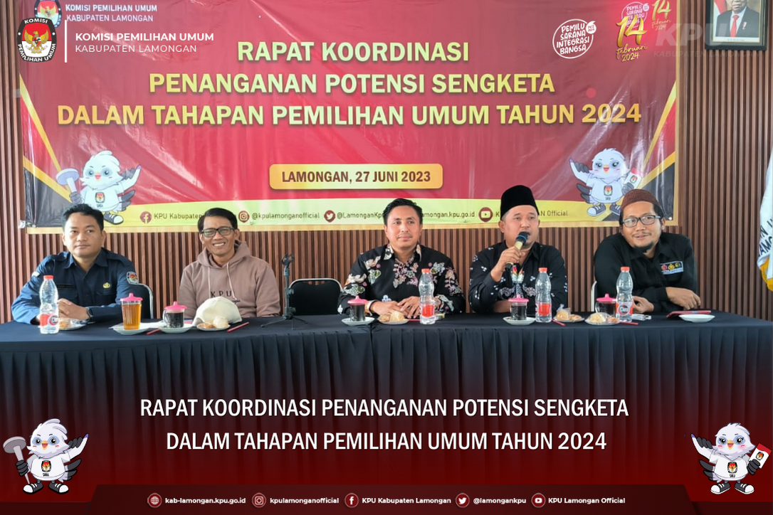 kab-lamongan.kpu.go.id Lamongan, KPU Kabupaten Lamongan mnggelar Rapat Koordinasi Penanganan Potensi Sengketa Dalam Tahapan Pemilihan Umum Tahun 2024, pada hari selasa (27/06), jam 09.00-11.00 WIB. Hadir sebagai peserta Rakor yaitu Divisi Hukum PPK Se-Kabupaten Lamongan. Dalam sambutannya, Khoirul Anam, Divisi Parmas, Sosdiklih dan SDM,menyampaikan bahwa Divisi Hukum berperan penting dalam proses tahapan pemilu yang terjadi di Kecamatan. Divisi hukum bertugas menyampaikan dan mendiskusikan regulasi terbaru terkait kepemiluan maupun sistematika Berita Acara pada kecamatan masing-masing. Setiap tahapan pemilu memiliki pijakan hukum berupa Undang-undang, Peraturan KPU, Keputusan dan seterusnya. Harapannya Divisi hukum dapat menjadi payung yang menaungi Divisi-Divisi di tingkat kecamatan terkait regulasi dalam menjalankan proses tahapan tingkat kecamatan. Selanjutnya materi mengenai potensi sengketa dalam tahapan pemilu disampaikan oleh Siswanto, Divisi Hukum. Siswanto menjelaskan bahwa saat ini tahapan masing berlangsung dan menjelaskan potensi sengketa kedepan pada tahapan pencalonan hingga pemungutan suara.