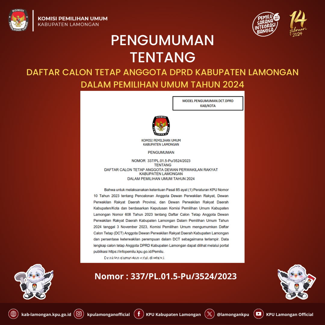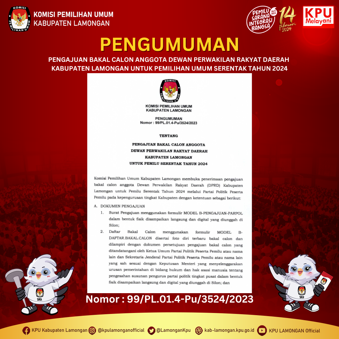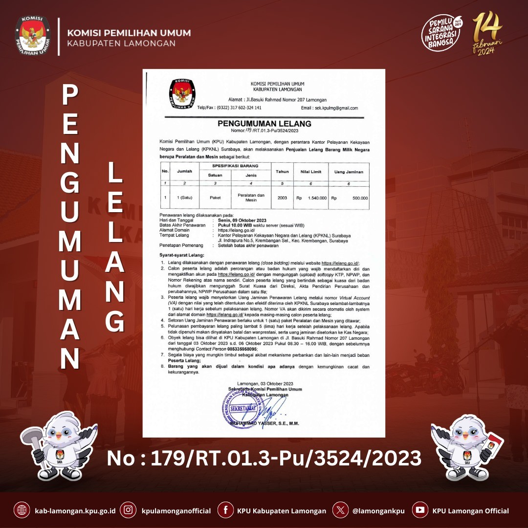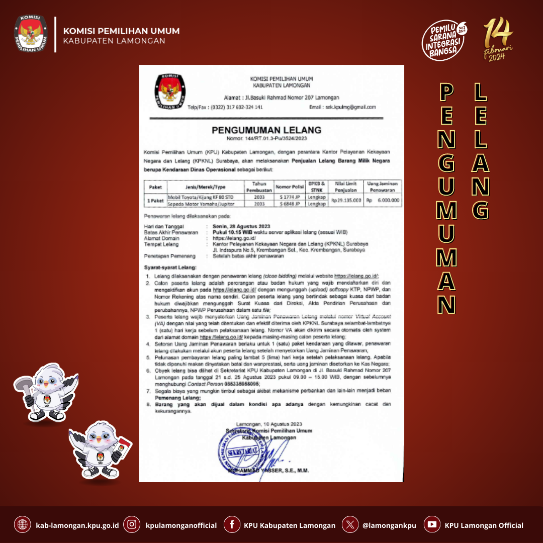 KPU Kabupaten Lamongan akan mengadakan lelang kendaraan melalui KPKNL Surabaya dengan pelaksanaan lelang tanggal 09 Oktober 2023 yang dilakukan melalui website https://lelang.go.id/ secara close bidding (penawaran tertutup) dengan batas akhir penawaran pukul 10.00 WIB.