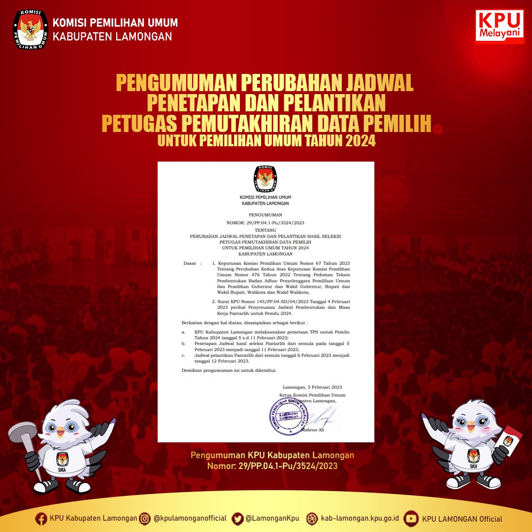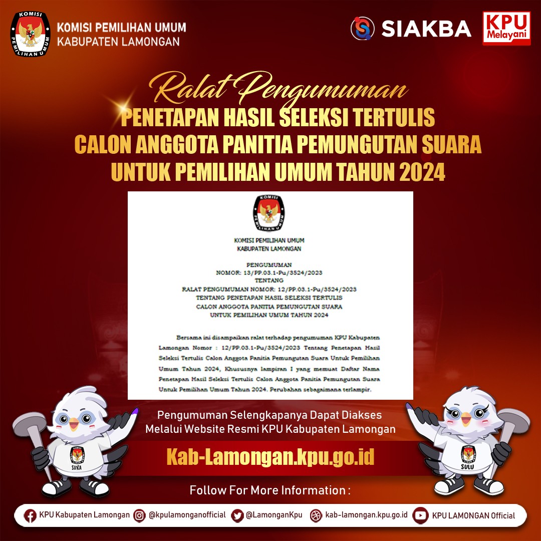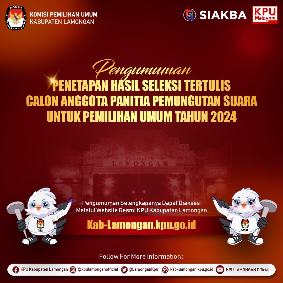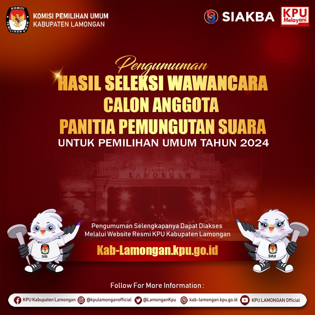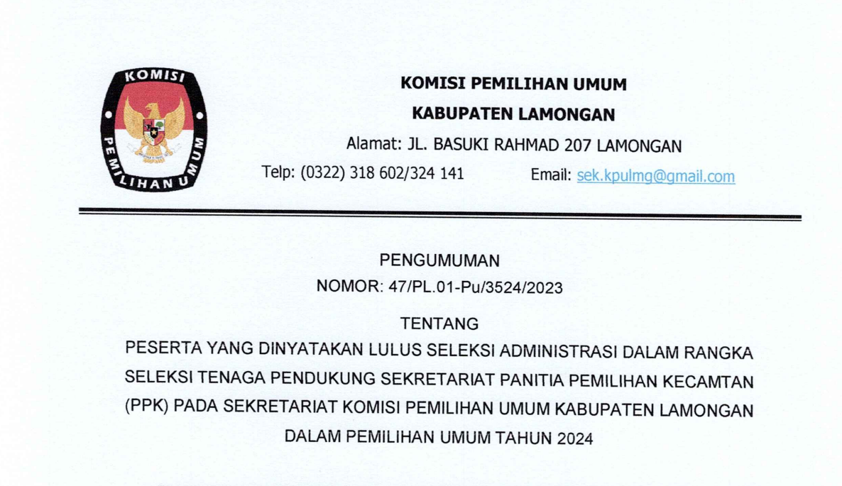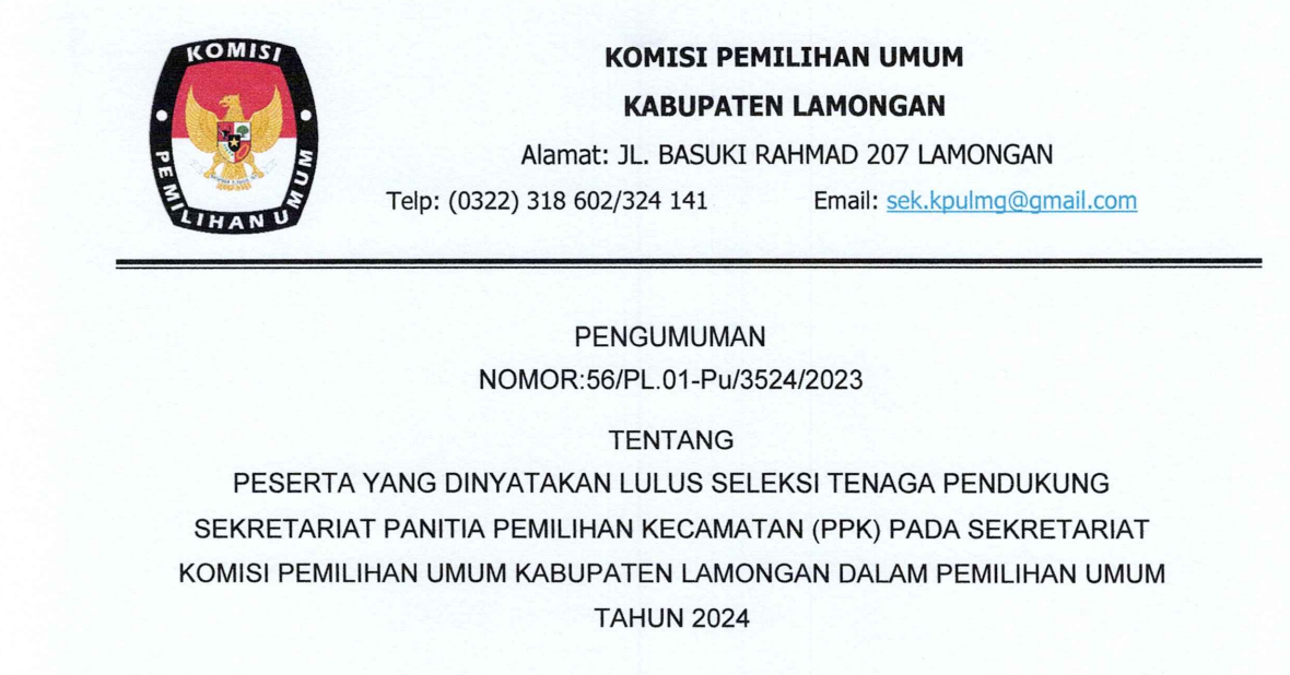 Berdasarkan hasil seleksi wawancara Seleksi Tenaga Pendukung Sekretariat Panitia Pemilihan Kecamatan (PPK) pada Sekretariat Komisi Pemilihan Umum Kabupaten Lamongan dalam Pemilihan Umum Tahun 2024, diumumkan bahwa peserta sesuai lampiran dinyatakan Lulus Seleksi Tenaga Pendukung Sekretariat Panitia Pemilihan Kecamatan (PPK) pada Sekretariat Komisi Pemilihan Umum Kabupaten Lamongan dalam Pemilihan Umum Tahun 2024.