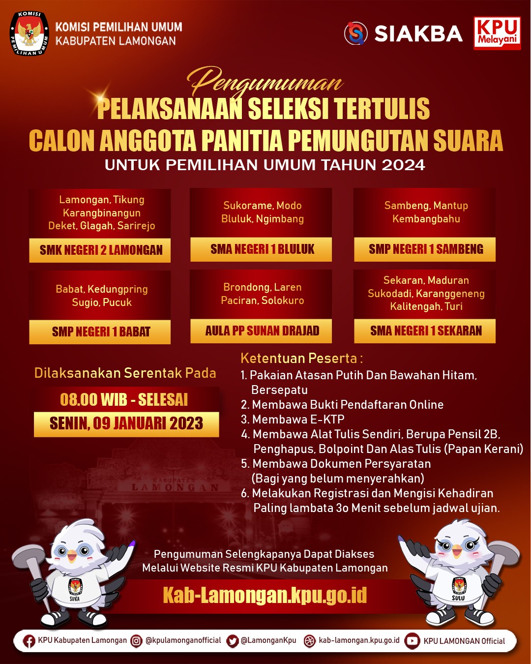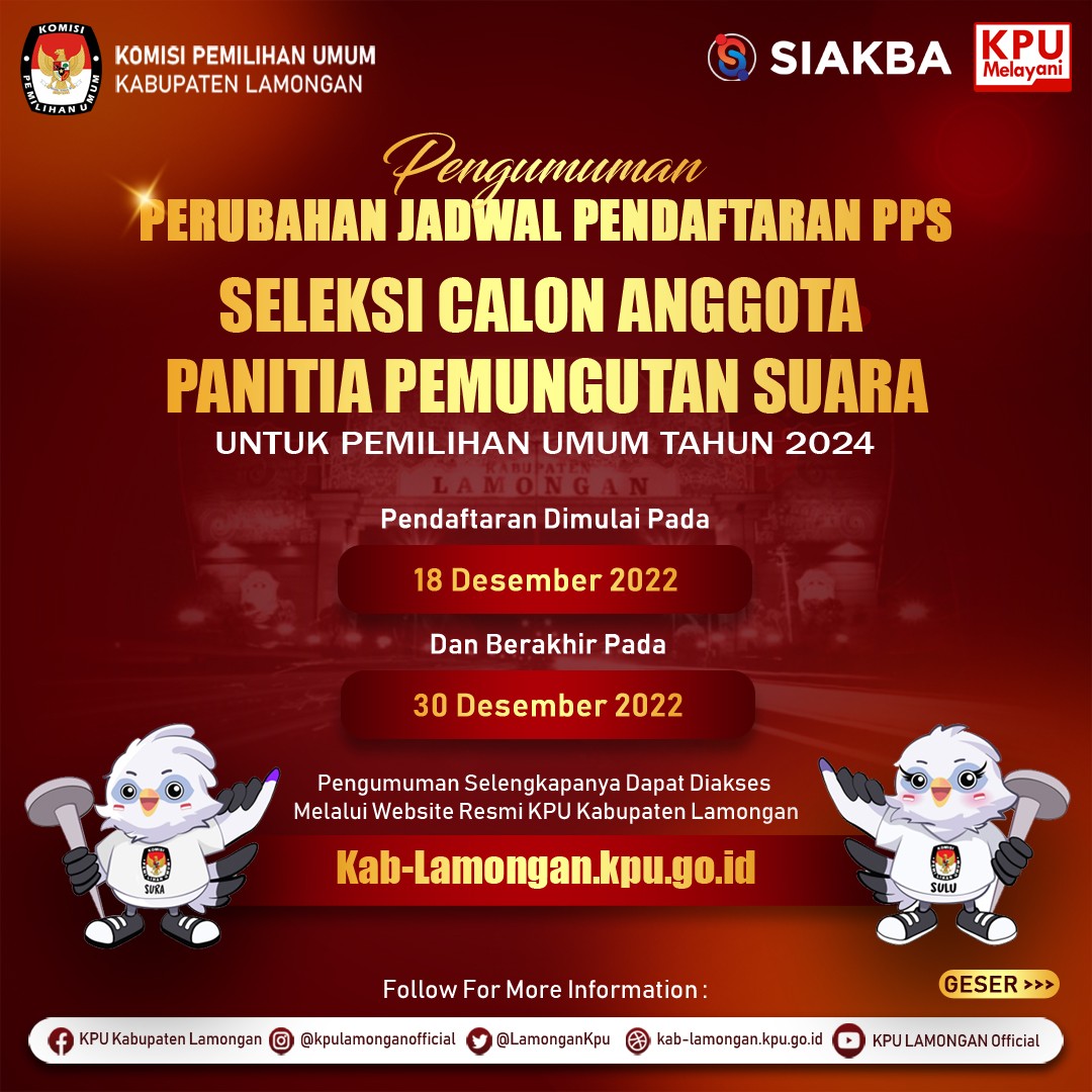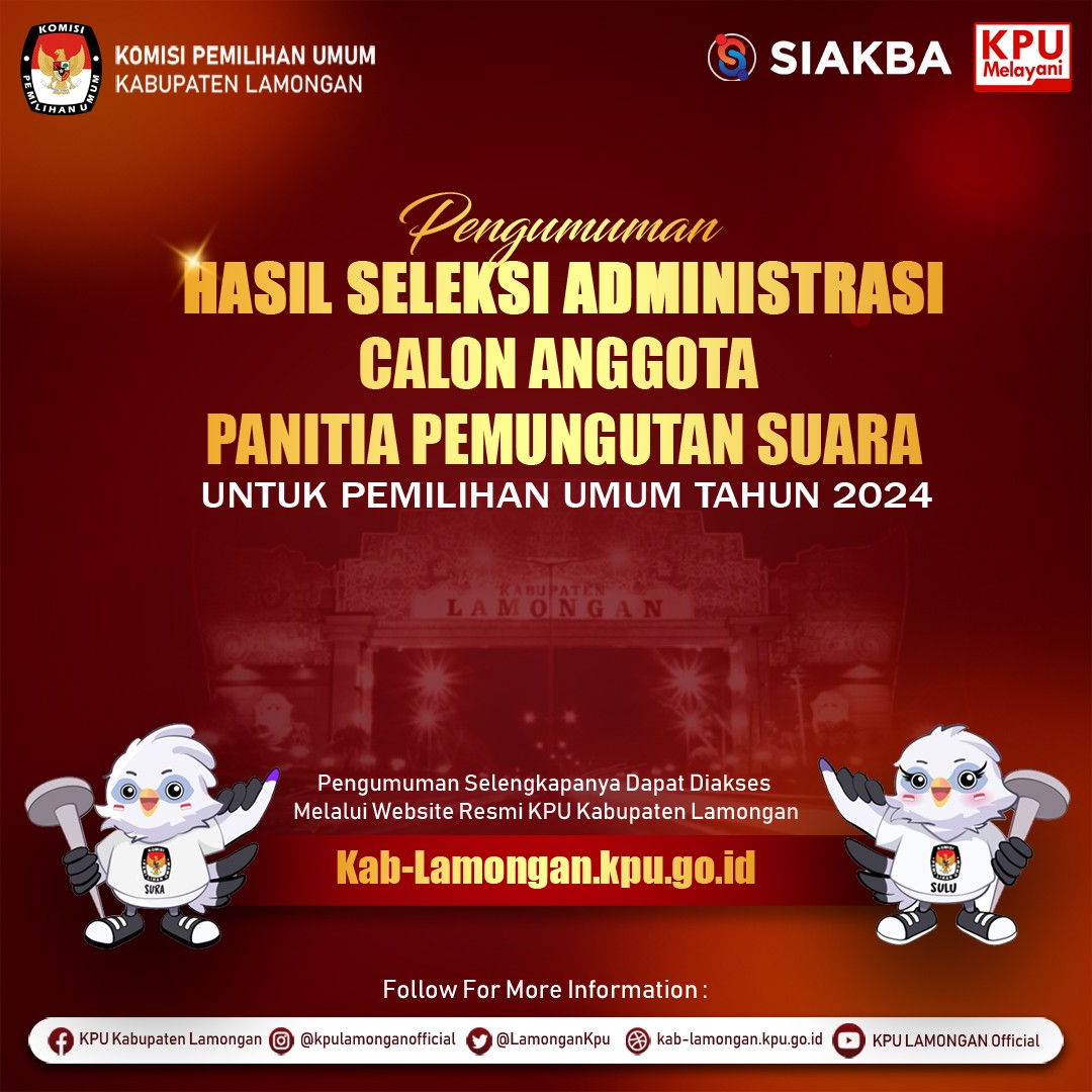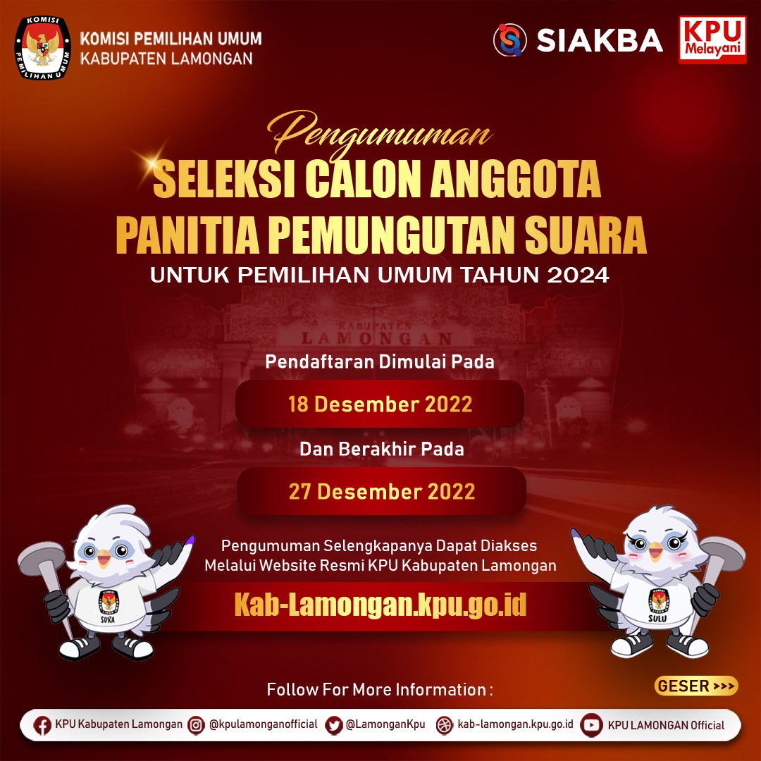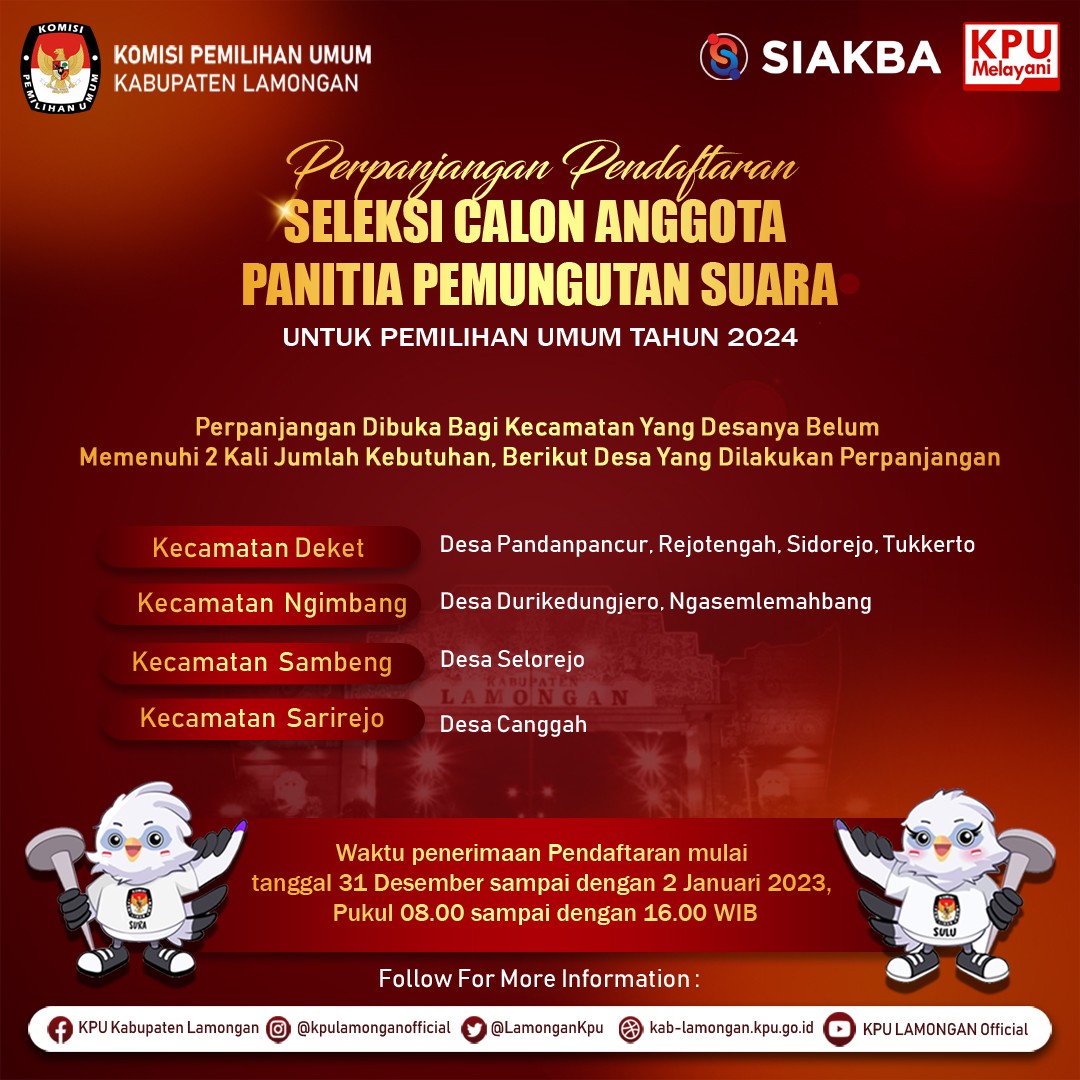 Sehubungan dengan hal tersebut, KPU Kabupaten Lamongan membuka perpanjangan waktu pendaftaran seleksi calon anggota Panitia Pemungutan Suara pada kelurahan/desa sebagai berikut :