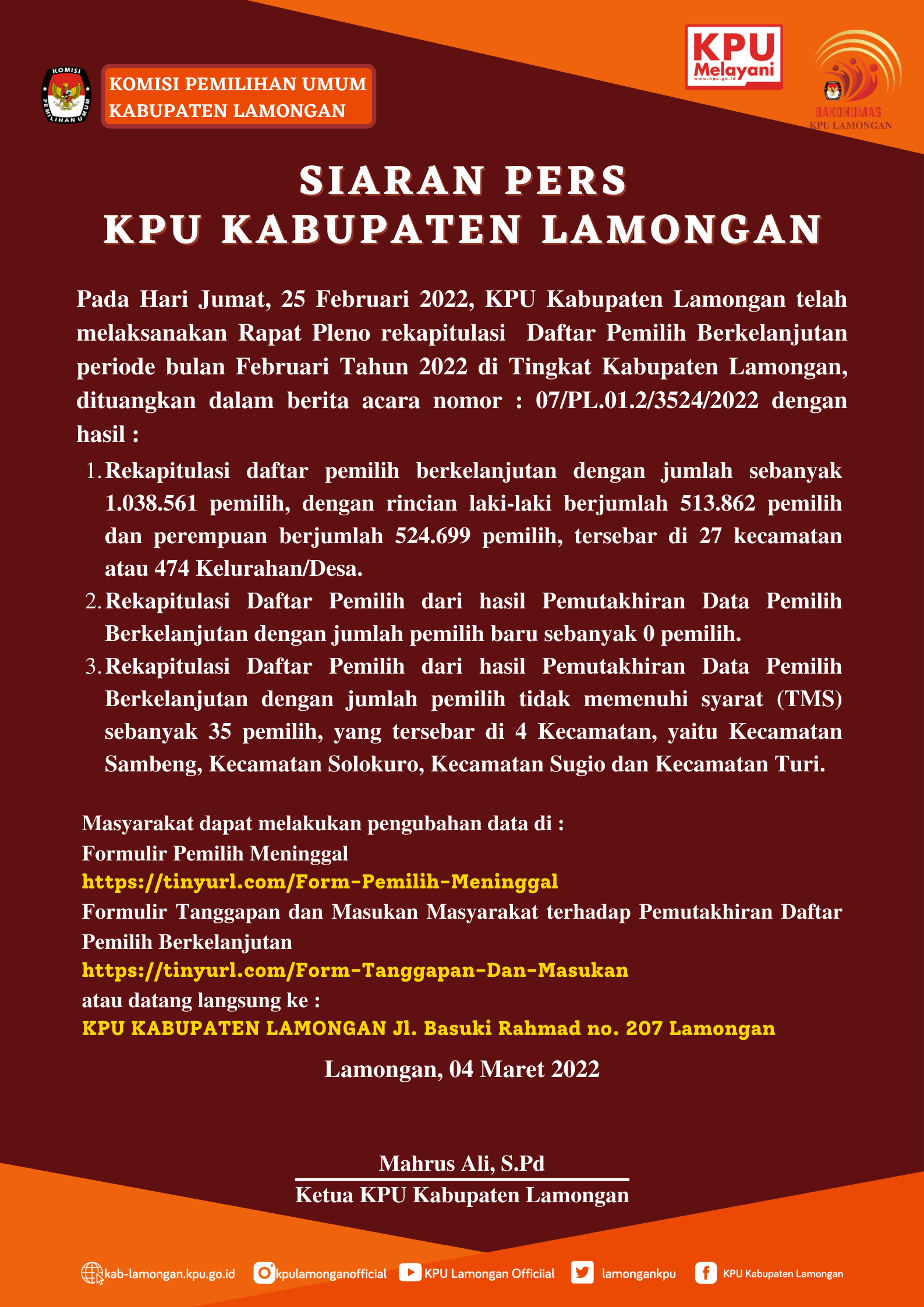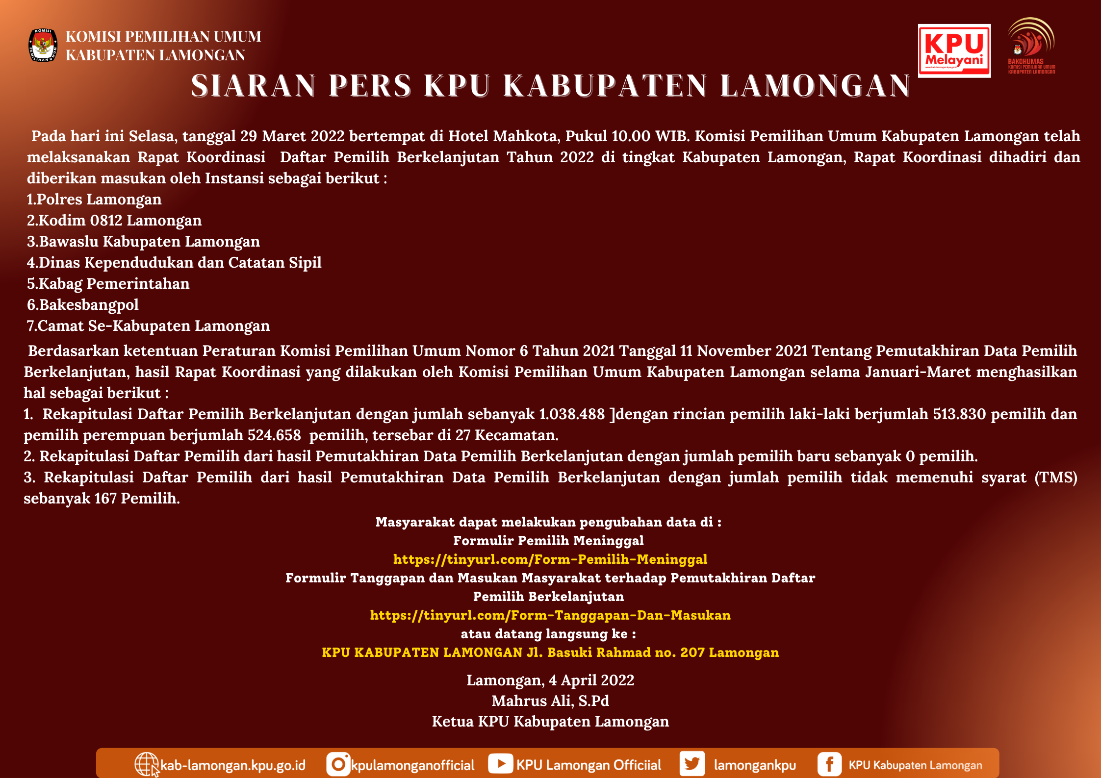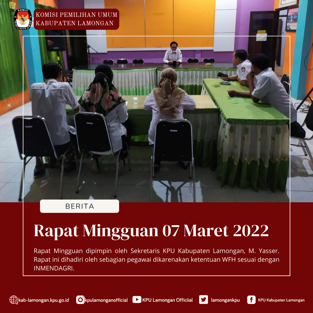 Rapat Rutin Mingguan dilaksanakan seperti biasa di media center KPU Lamongan. Rapat pada hari Senin(07/03/2022) ini menyampaikan mengenai laporan kerja dan rencana seminggu kedepan. Yasser juga membahas untuk tetap bekerja dengan totalitas demi kesiapan Pemilu dan Pemilihan Tahun 2024.